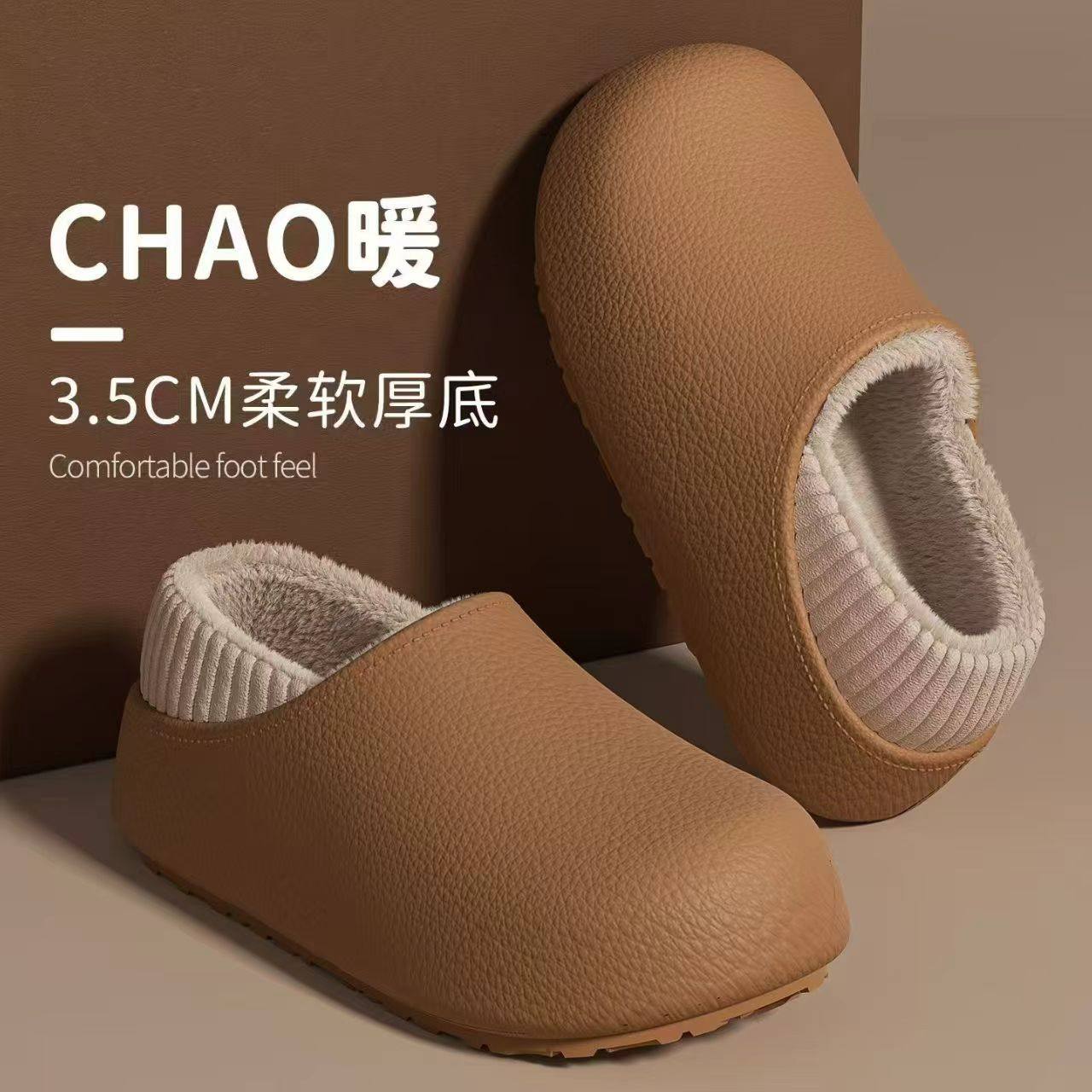 老人棉拖鞋女包跟冬季防水防滑厚底情侣加绒保暖带跟皮面男士棉鞋