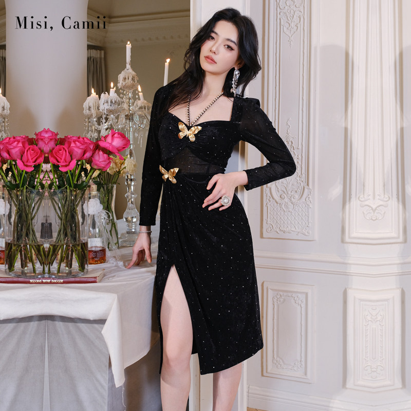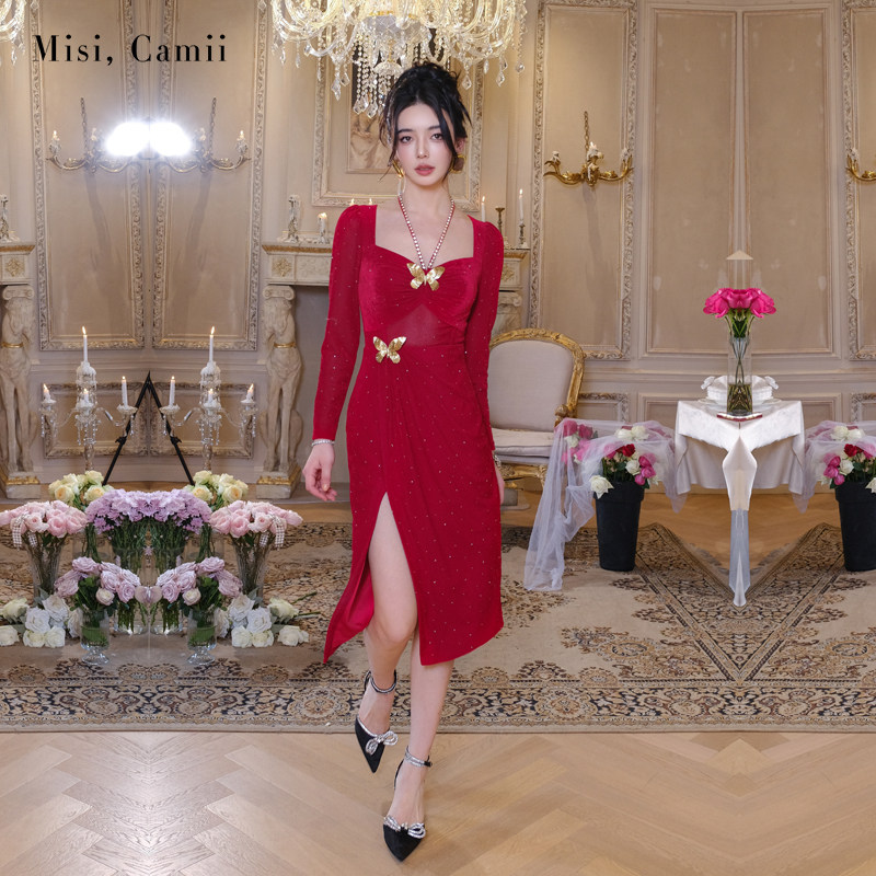 Misi.Camii2024秋冬新款女装名媛风高贵红色繁星烫钻丝绒长连衣裙