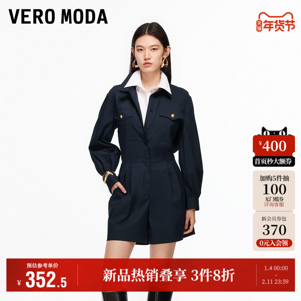 Vero Moda奥莱连体裤女2025秋冬新款含棉翻领压褶纯色长袖短裤
