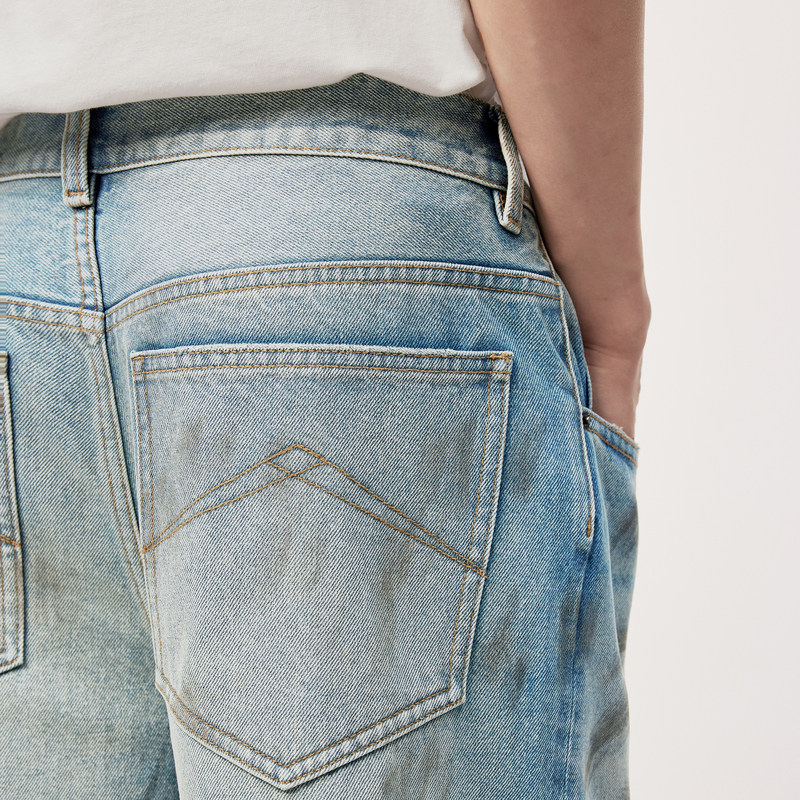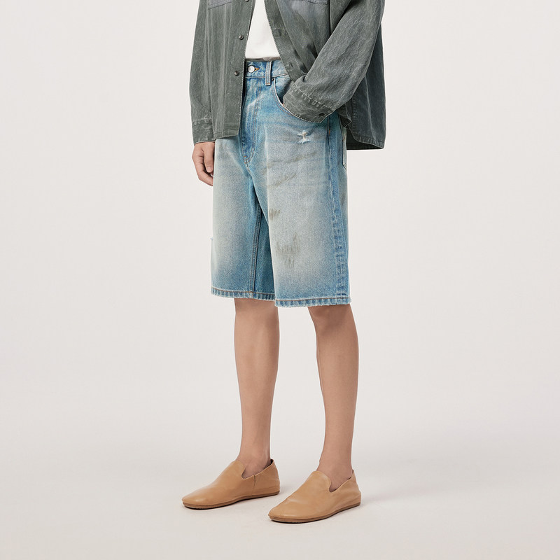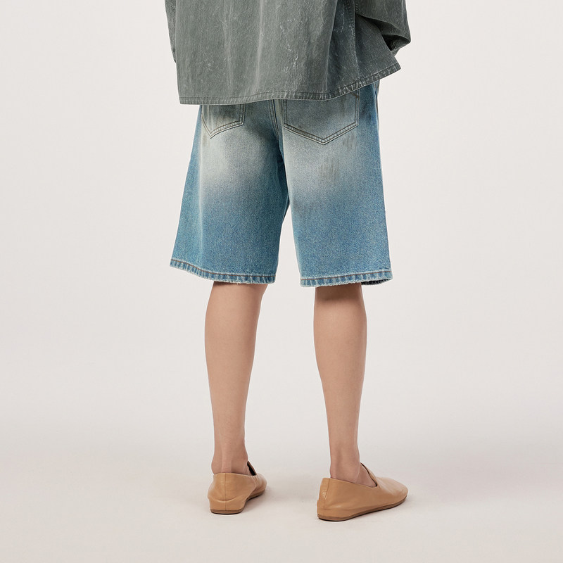 速写男装直筒牛仔裤夏季新款脏染设计感破洞复古宽松男士中短裤潮