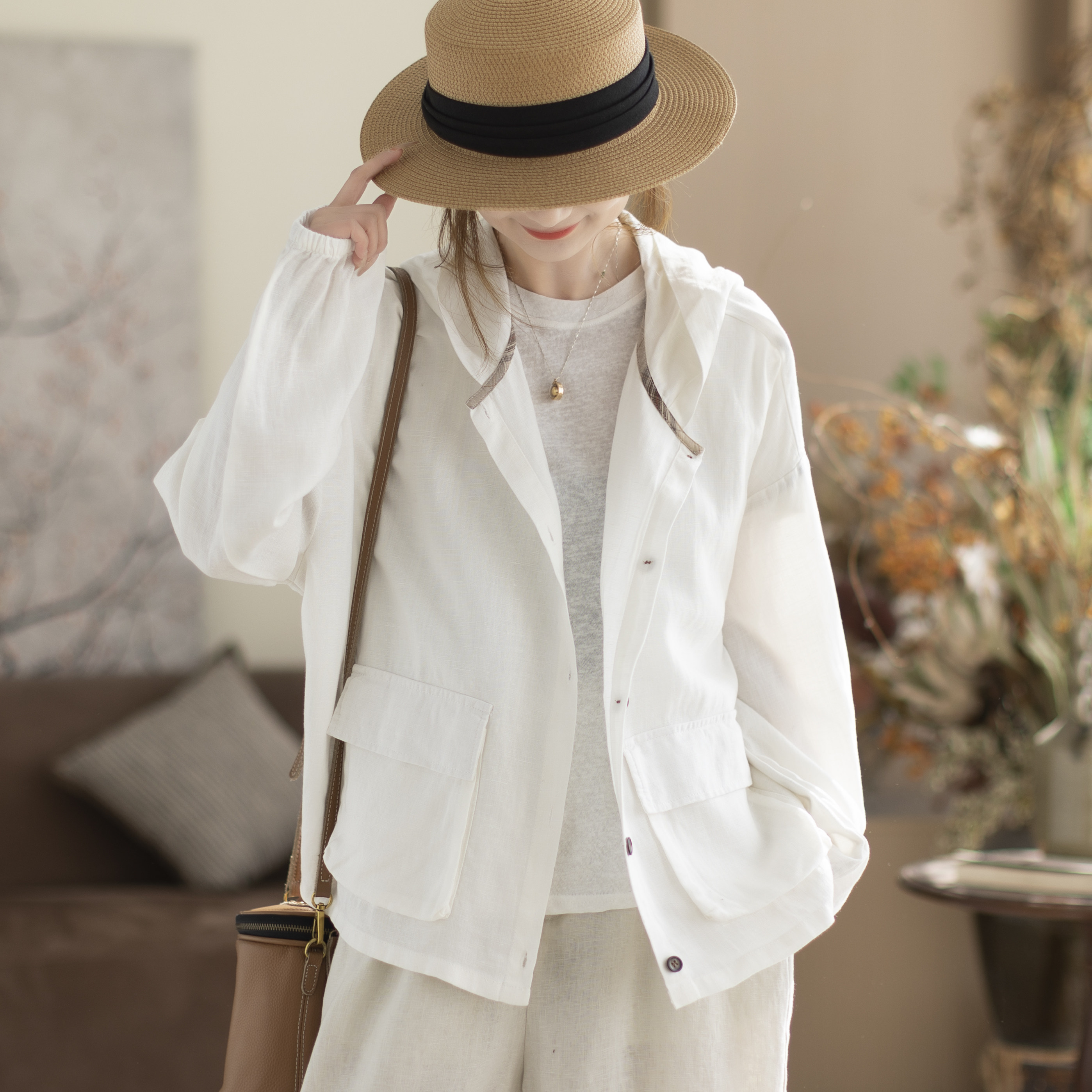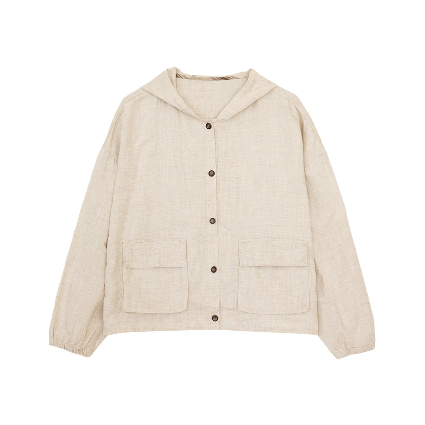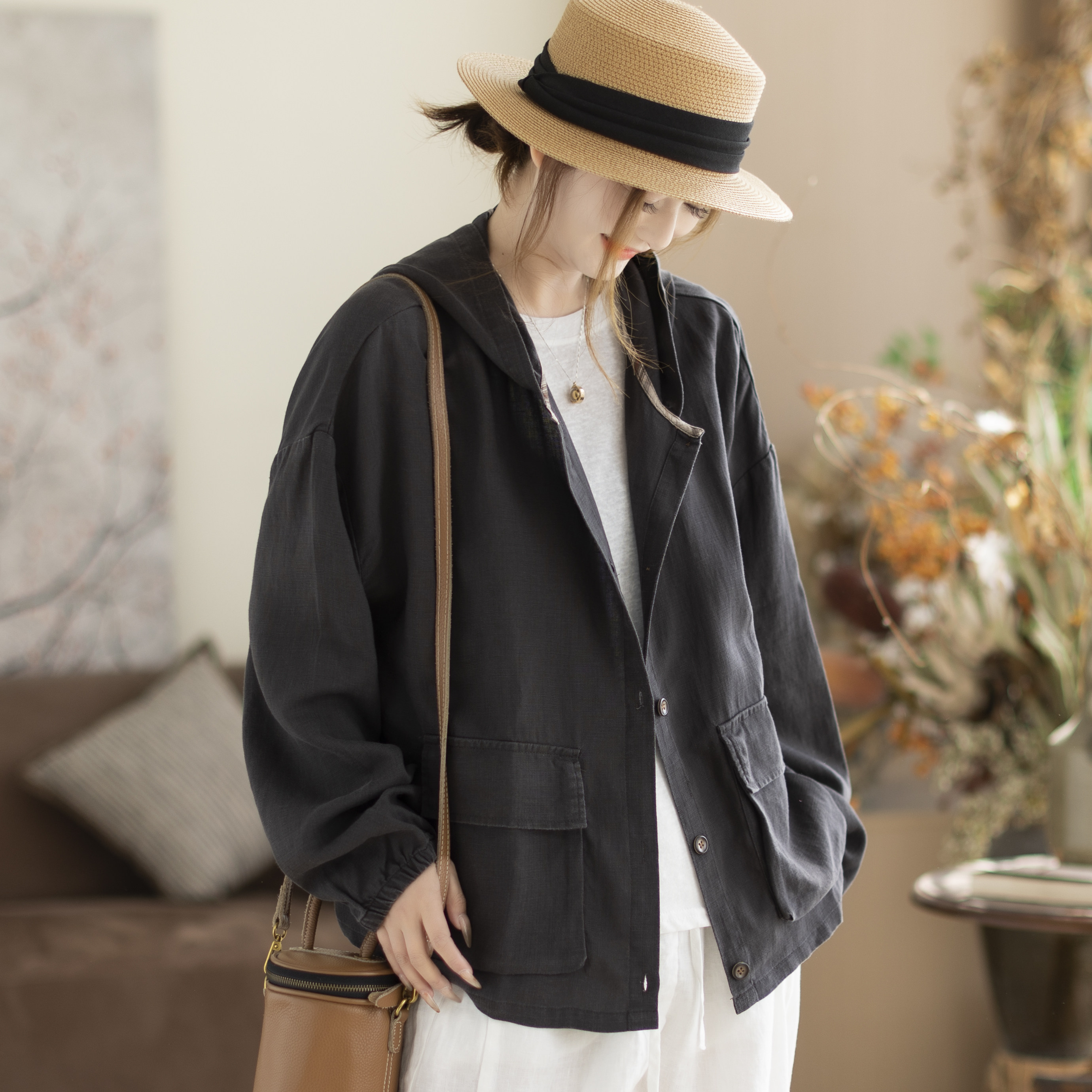 咖咪羽天丝麻大码女装连帽纯色麻衬衫宽松百搭休闲单排扣外套