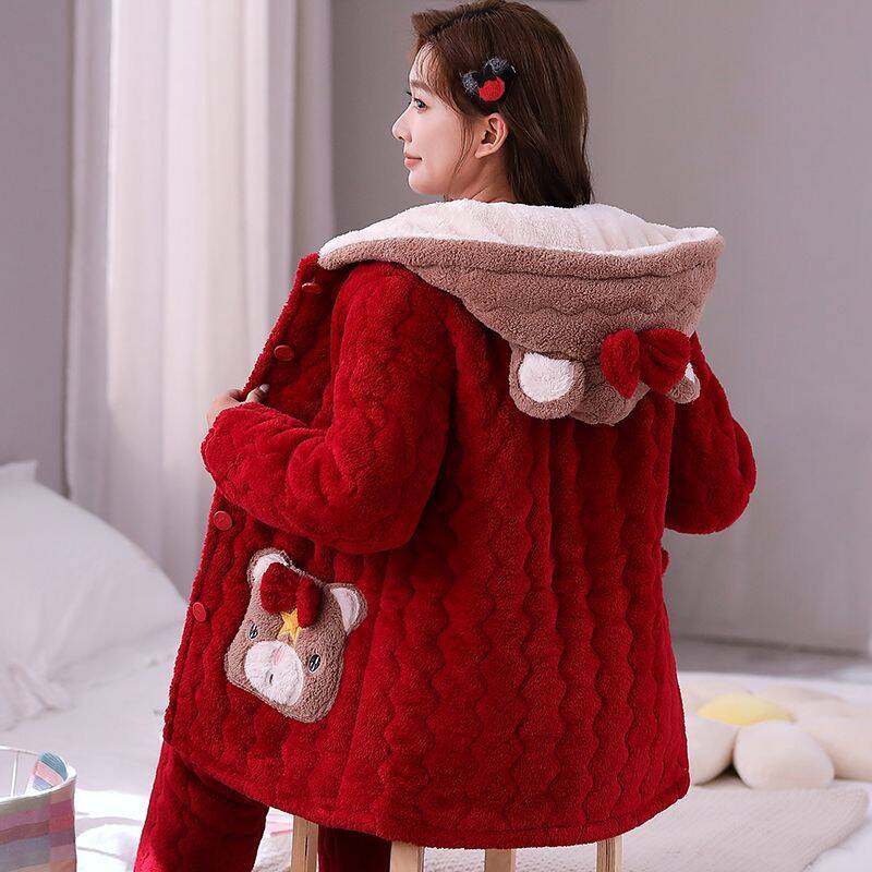 睡衣女秋冬季三层夹棉袄加绒加厚韩版可爱珊瑚绒保暖家居服套装