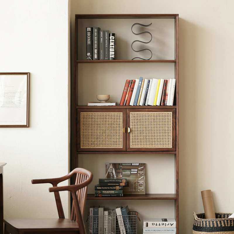 北欧全实木书柜书架简约现代黑胡桃木书架藤编落地收纳柜置物斗柜