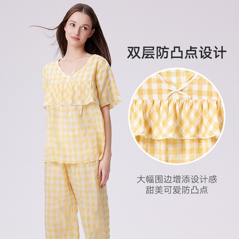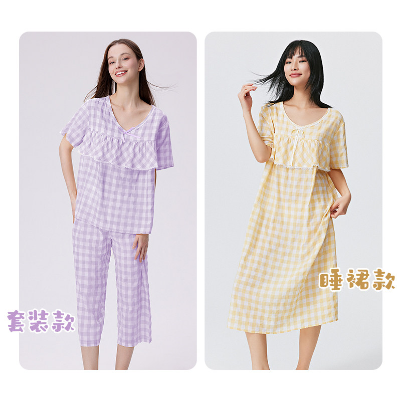 兰卓丽家居服女套装短袖七分裤防凸点睡衣格子可外穿夏季薄款舒适