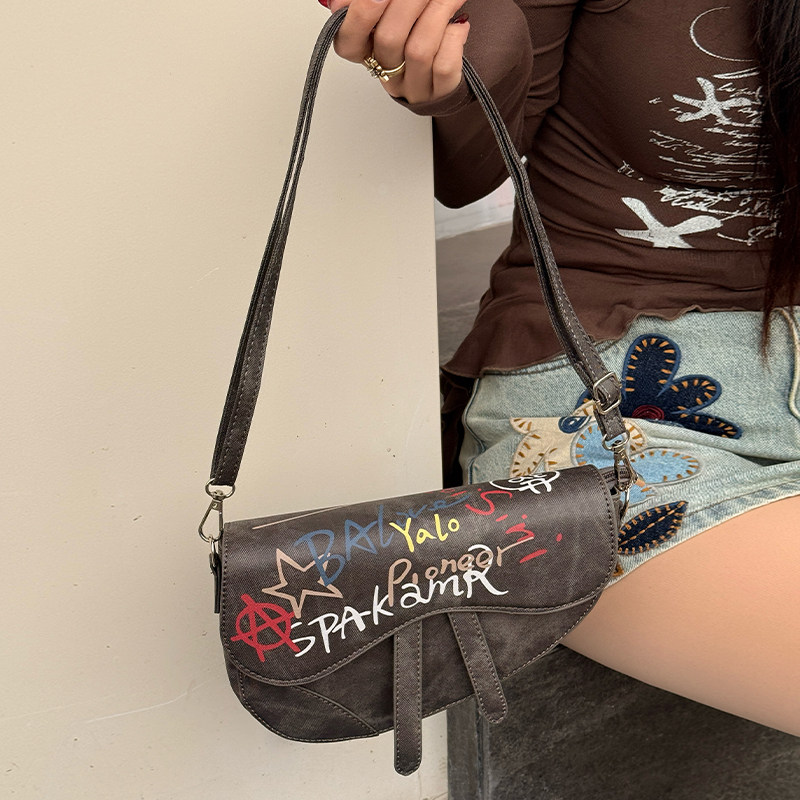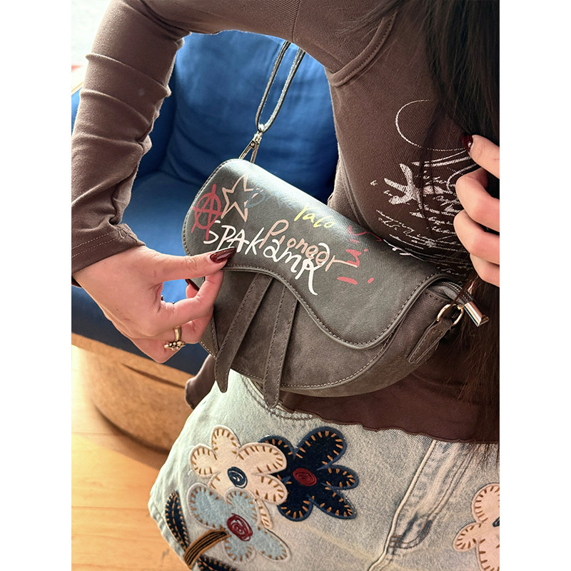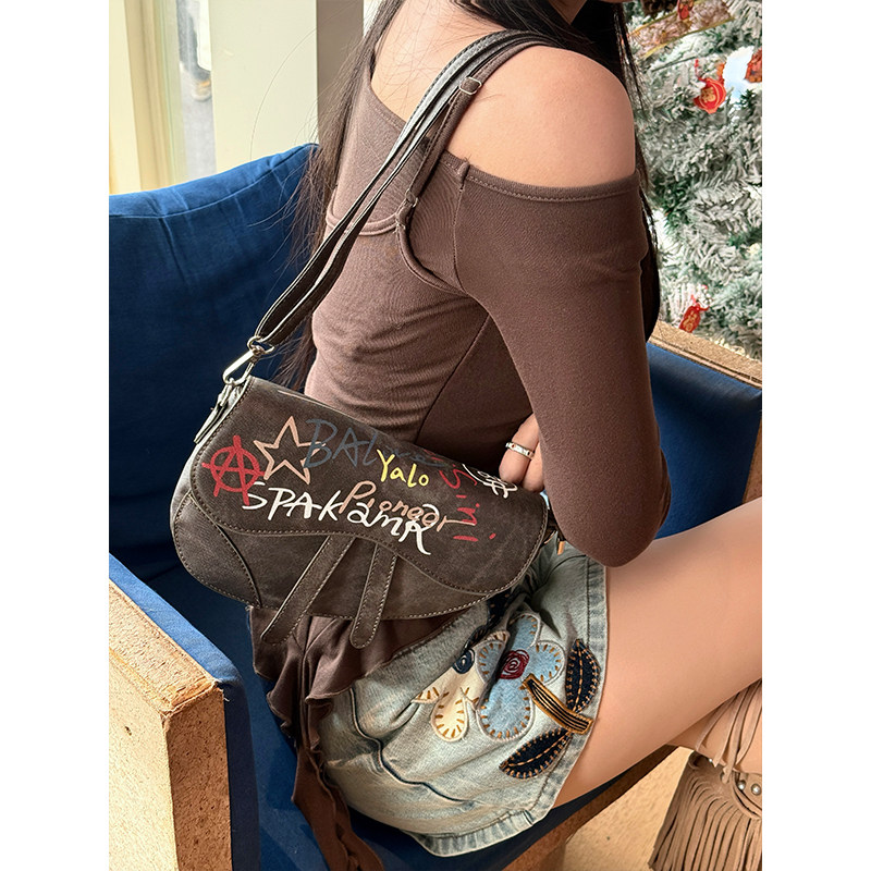 妖精的口袋复古涂鸦马鞍包女2026年新款重工鬼马街头单肩包斜挎包