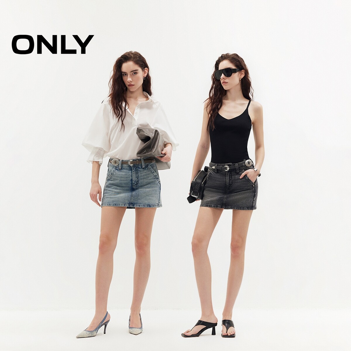 ONLY2026夏季新款A字短款修身低腰复古水洗铆钉装饰牛仔半身裙女
