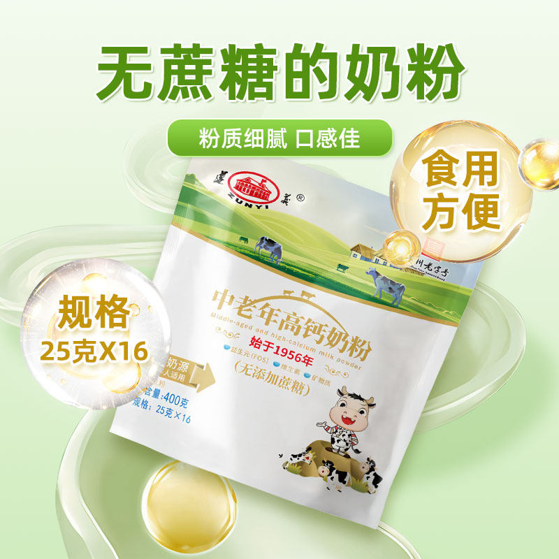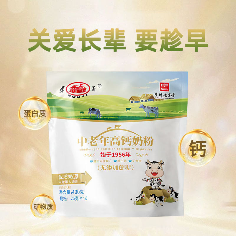 遵义乳业中老年高钙奶粉400g无蔗糖高蛋白益生元维生素老年人袋装