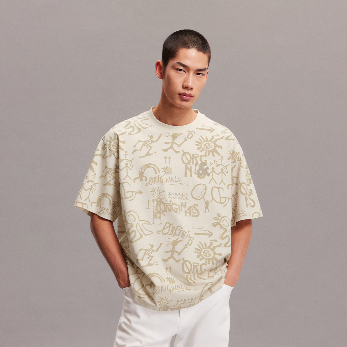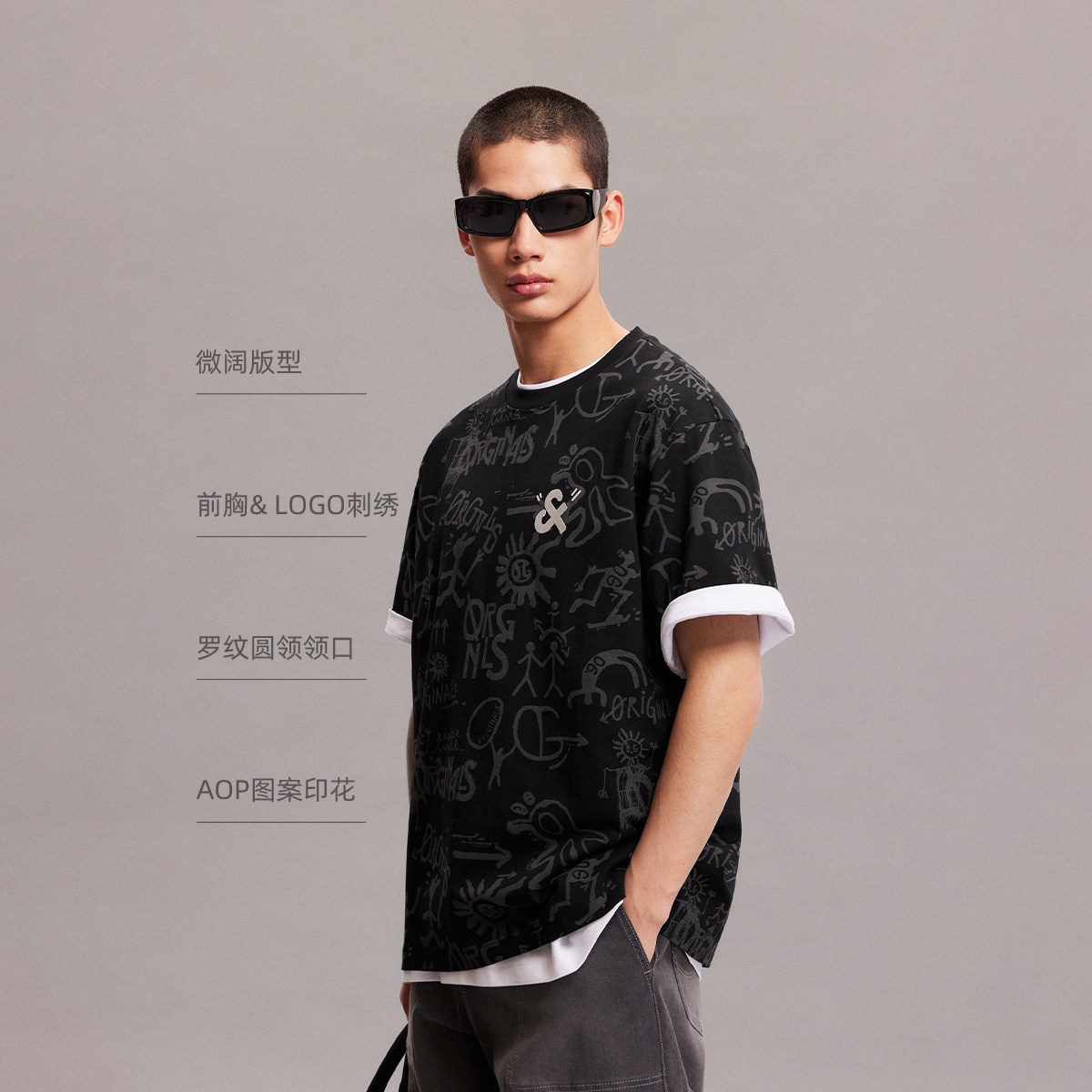 宽松版型 衣身满印图案 胸前刺绣LOGO装