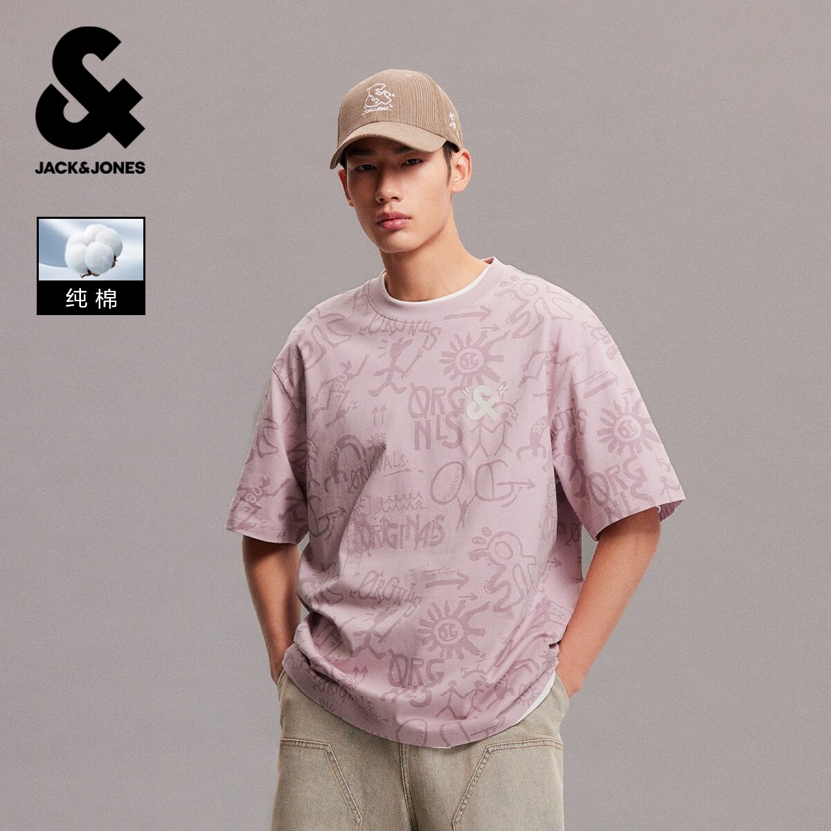 杰克琼斯男装2026年春夏新款宽松满印男士短袖T恤刺绣撞色打底衫