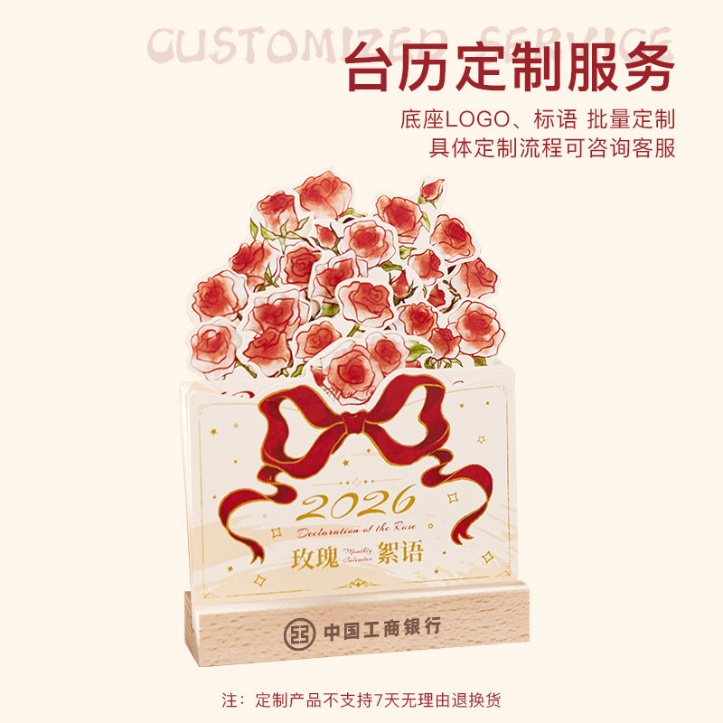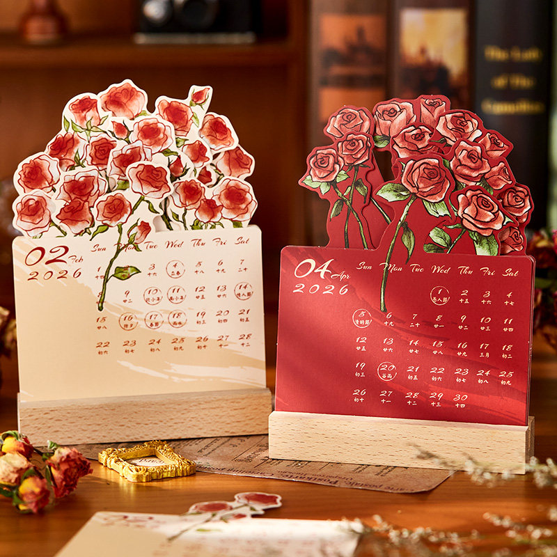 复古玫瑰插卡台历2026年新款高颜值文艺ins风木质立体插画日历学生桌面办公室摆件月历礼品生日礼物定制logo