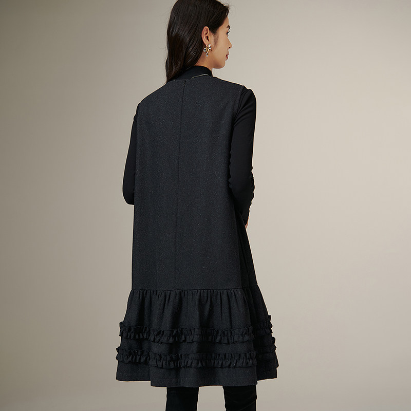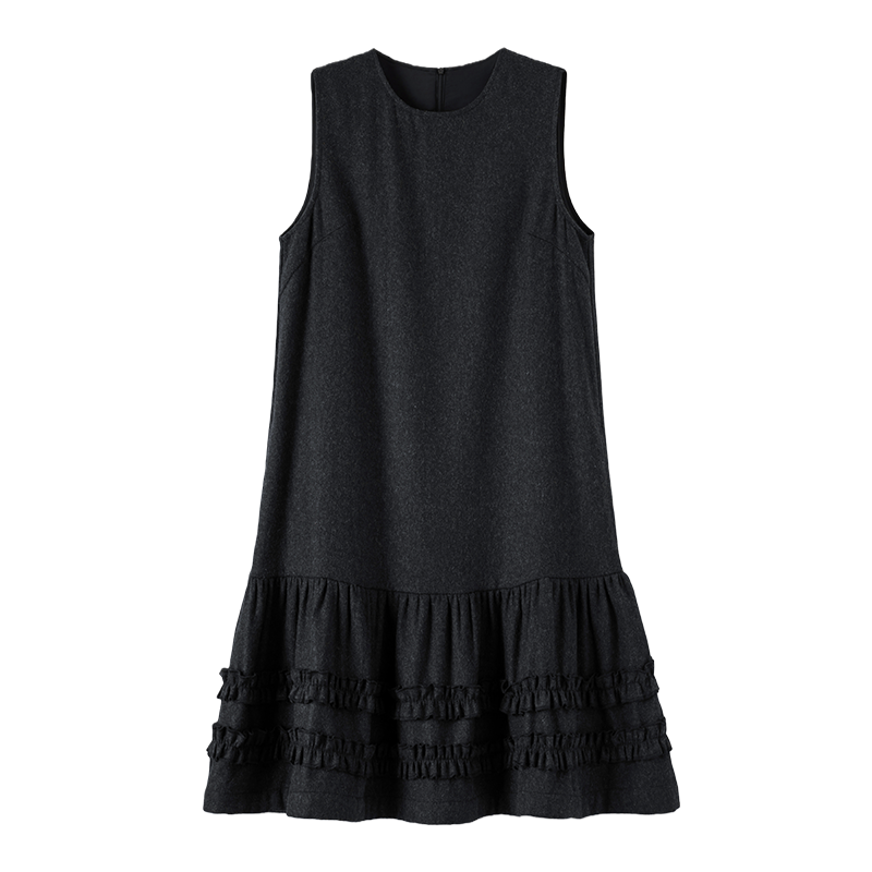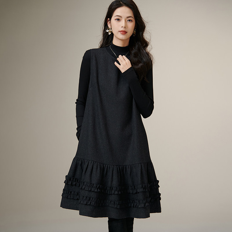 晚白2025年秋冬新款绵羊毛拼接毛呢裙子时尚优雅高级感无袖连衣裙