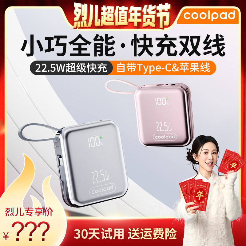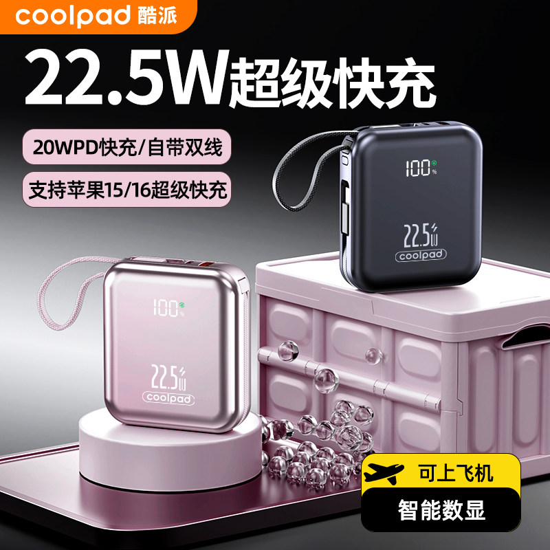 超值3C认证酷派大容量自带双线充电宝2万毫安时兼容22.5W超级快充1万便携移动电源数显闪充高铁飞机双向