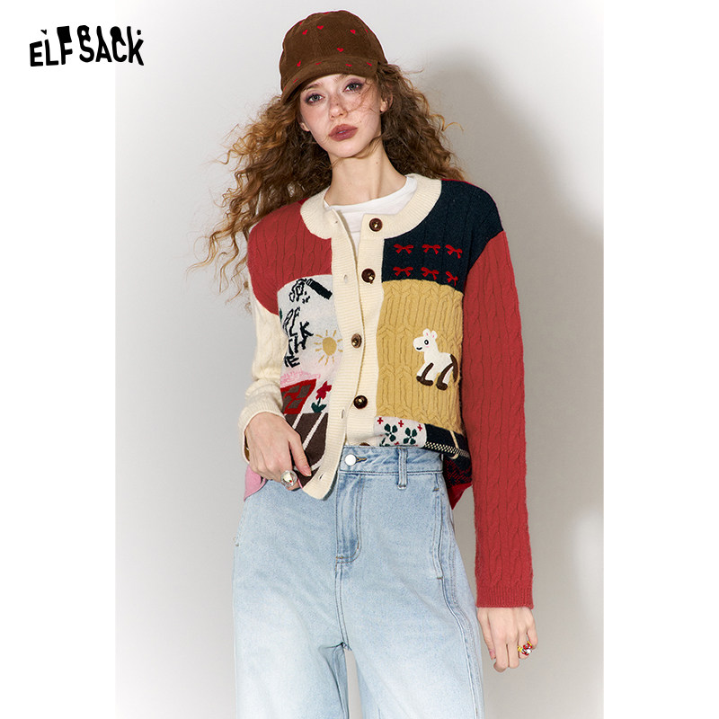 妖精的口袋趣味提花撞色拼接毛衣女2026年春秋新款设计感开衫外套