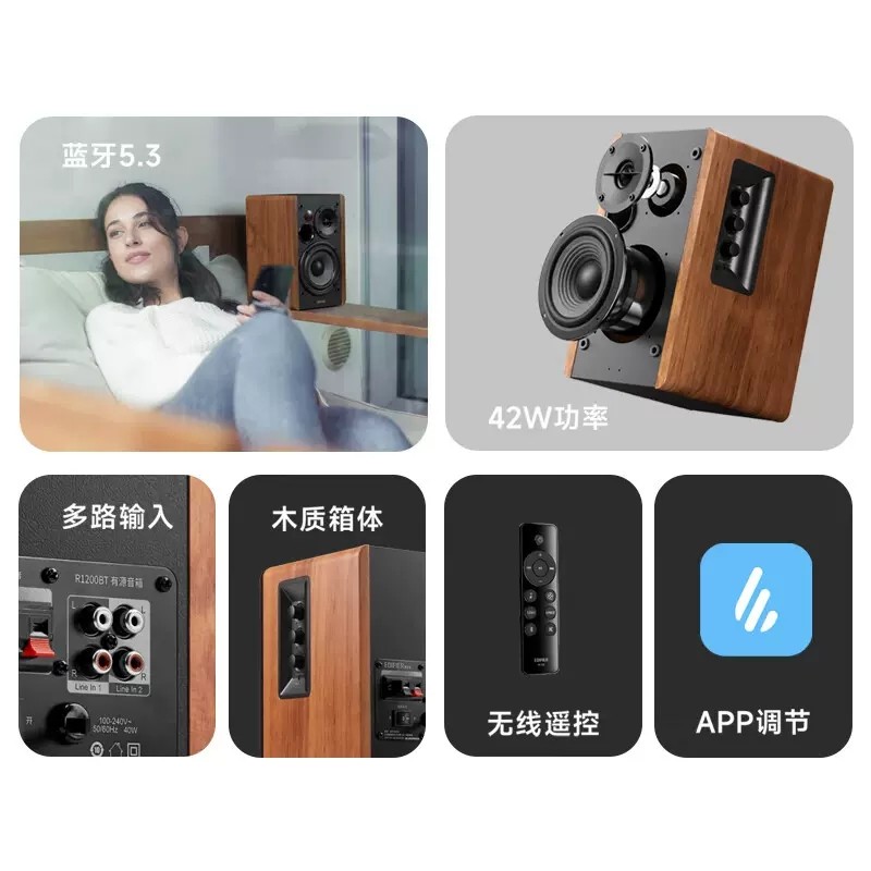 漫步者R1200BT电脑音响台式家用木质音箱多媒体桌面电视书架2.0