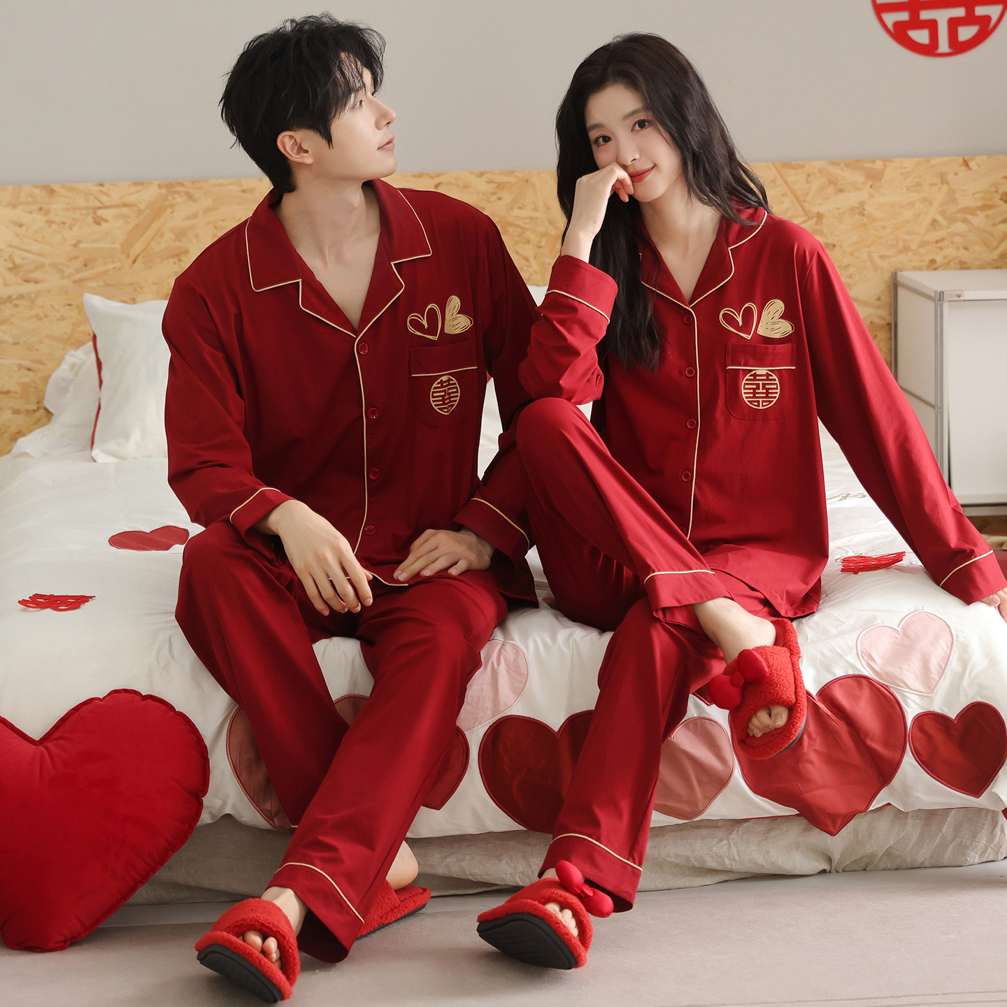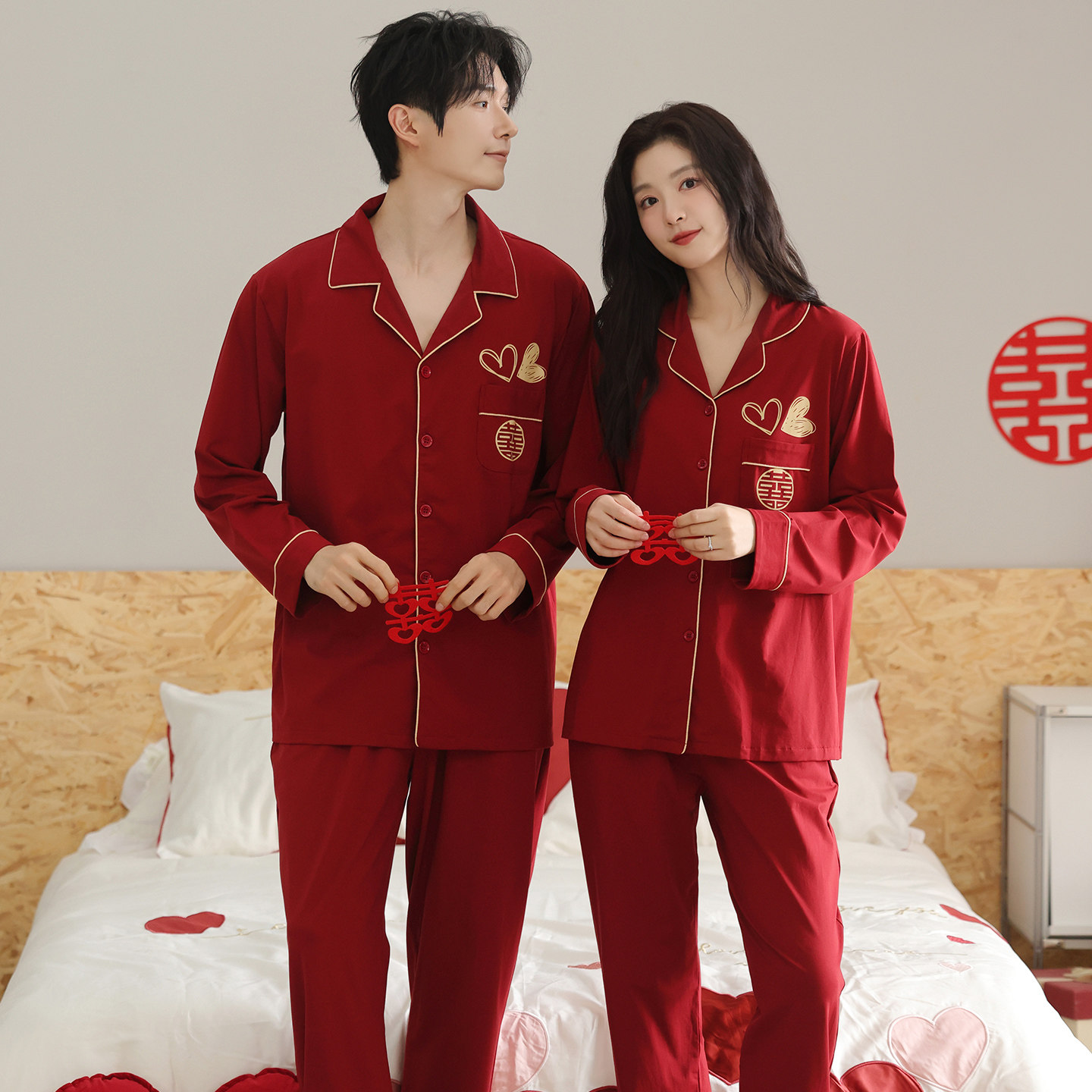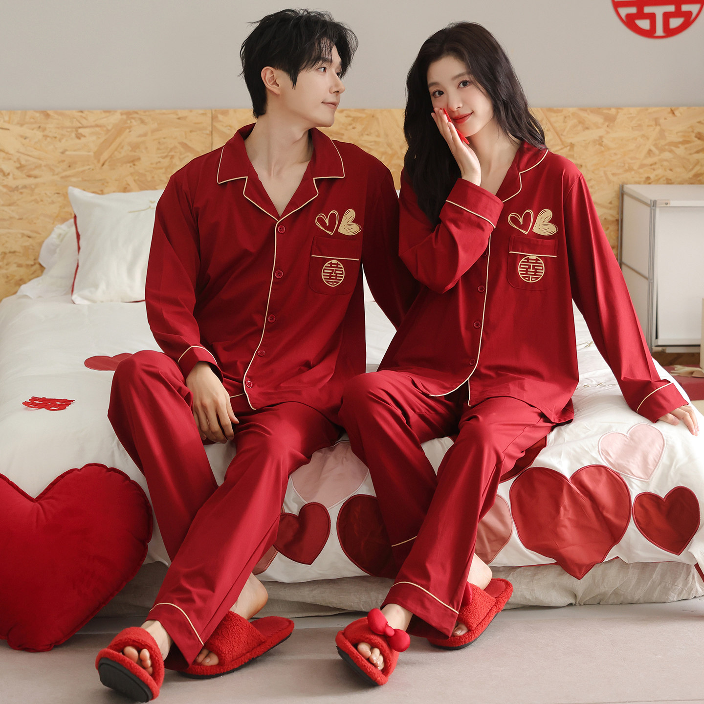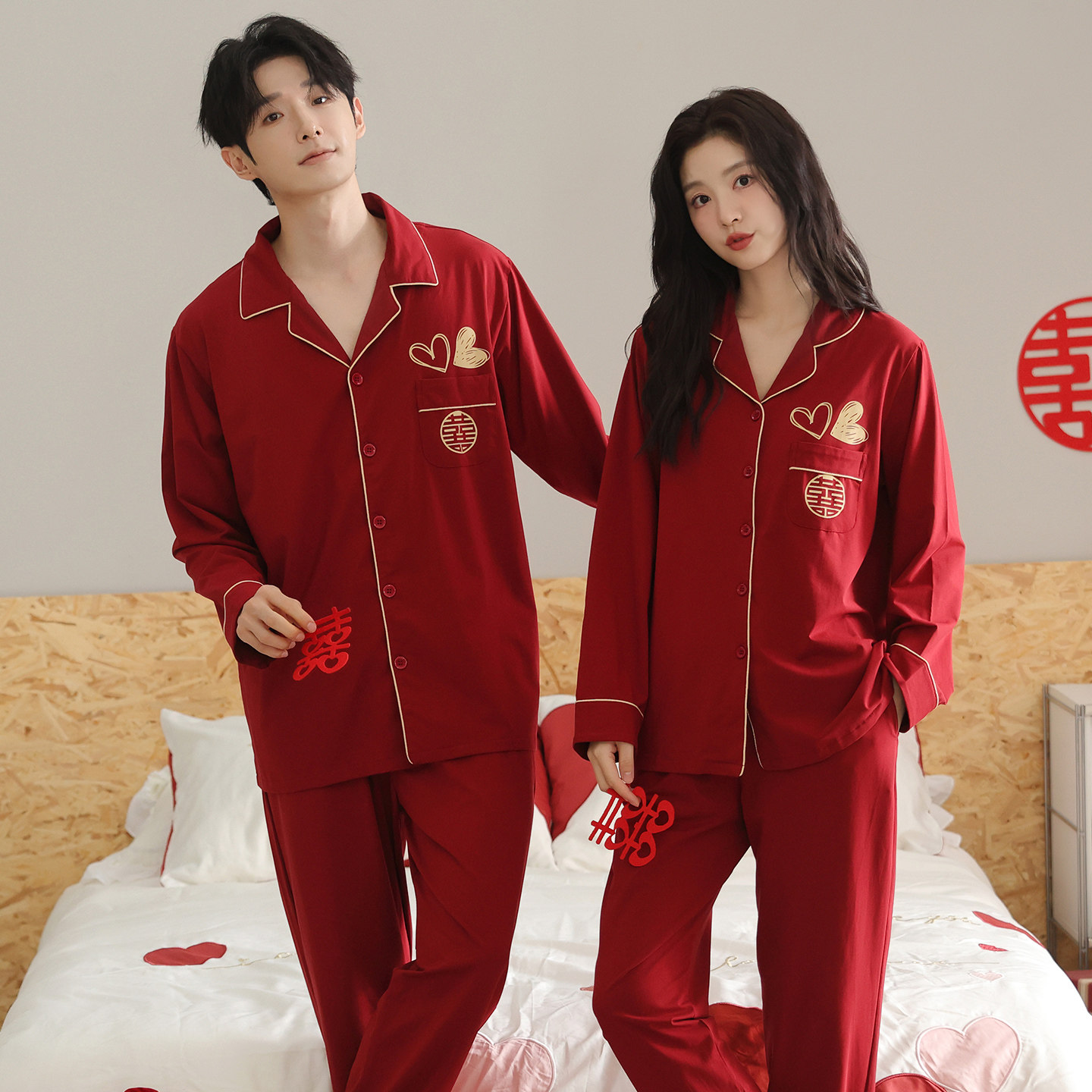 2025秋冬大红色睡衣情侣翻领开衫长袖睡衣套装本命年新婚家居服