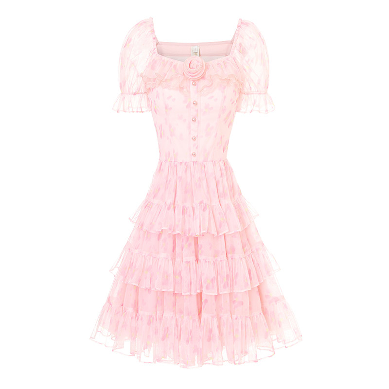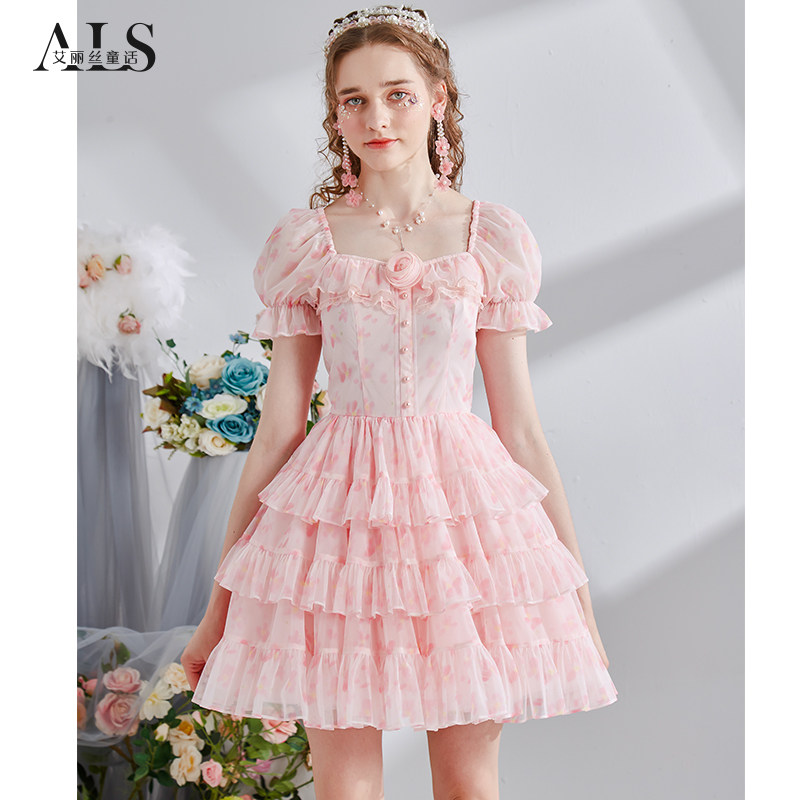 艾丽丝2025夏季新款甜美公主风蛋糕裙粉色印花短袖方领连衣裙短裙
