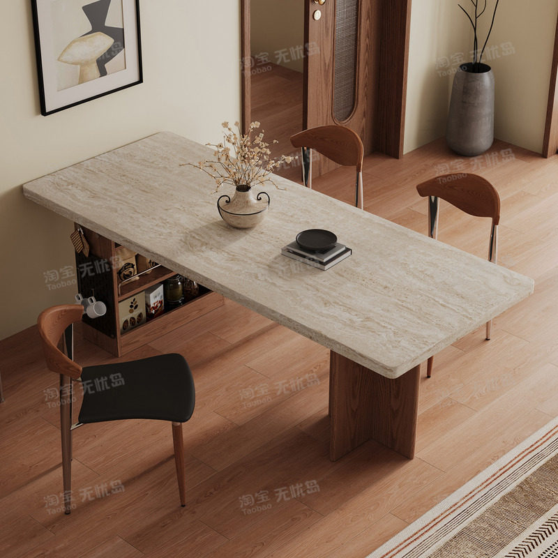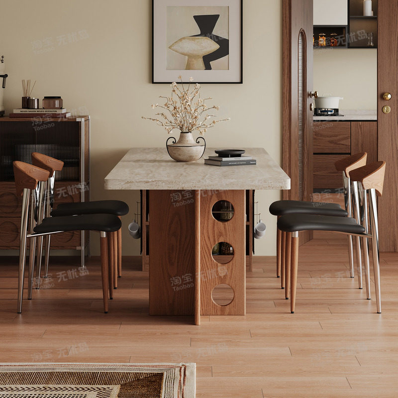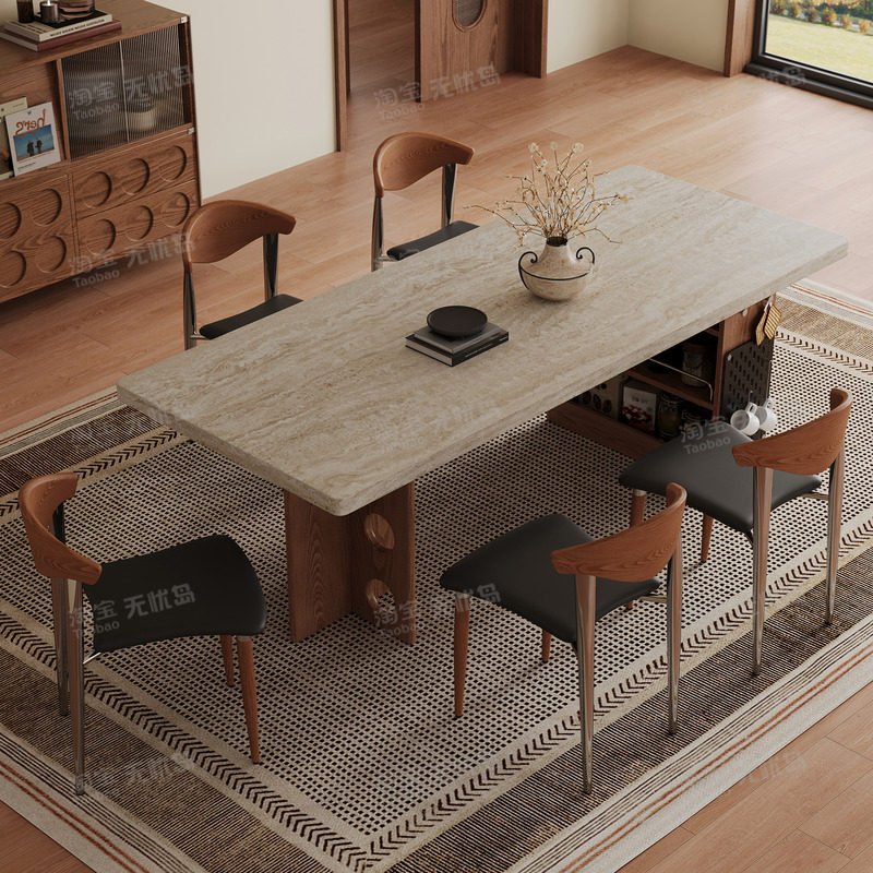 高级感长方形餐桌子中古风实木餐桌椅2026新款家用洞石岩板餐桌