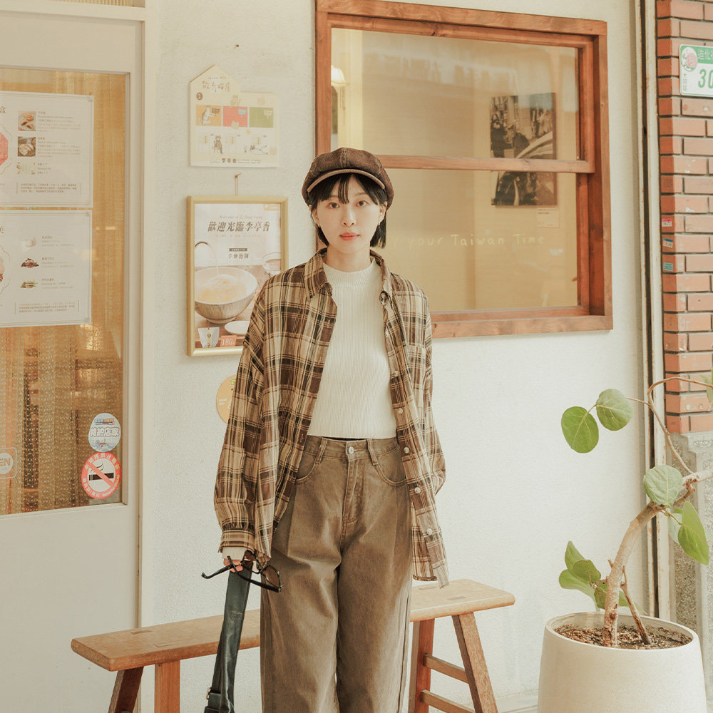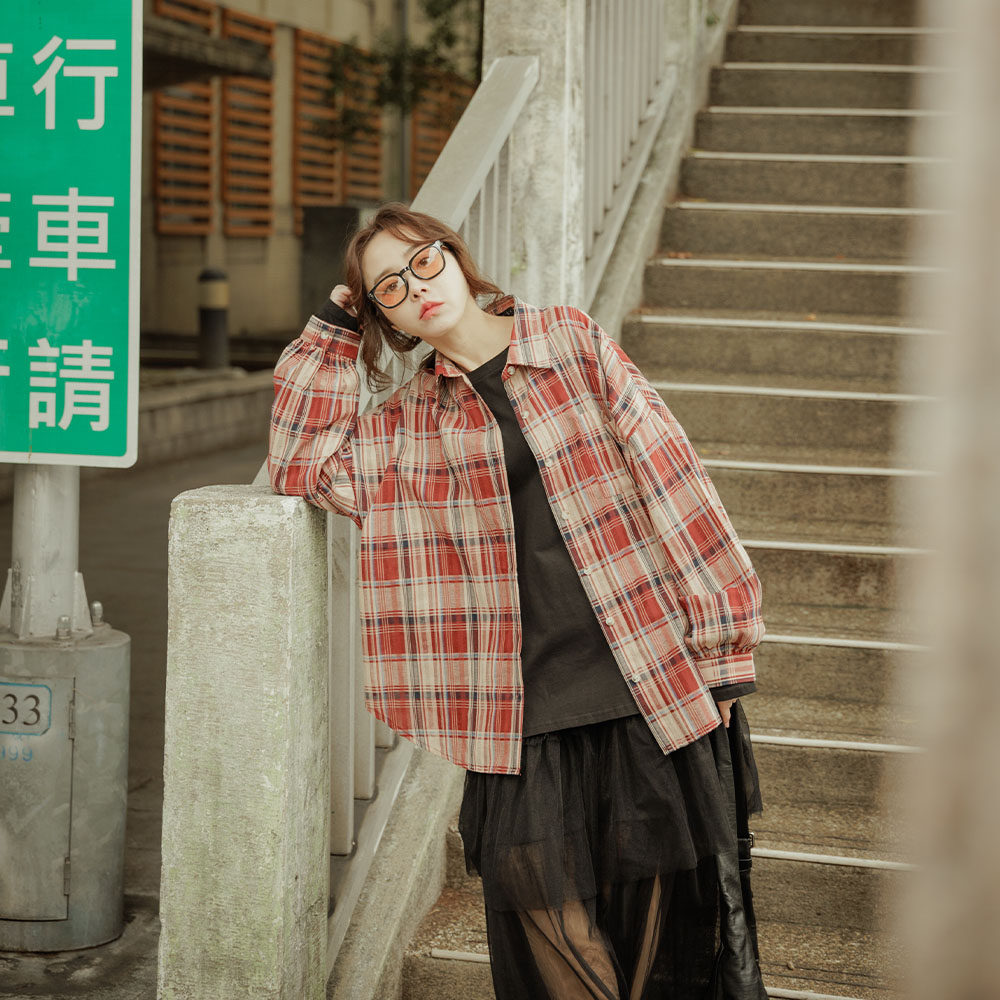 QUEENSHOP 2026春夏新品女装经典配色格纹宽版长袖衬衫01025744