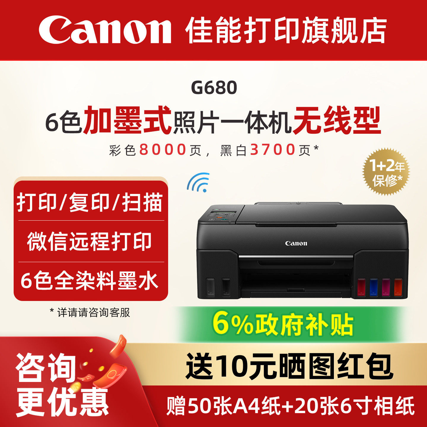 佳能旗舰店G580/G680原装加墨彩色A4喷墨打印复印扫描打印机一体机学生家用微信远程打印影楼6色照片可连手机