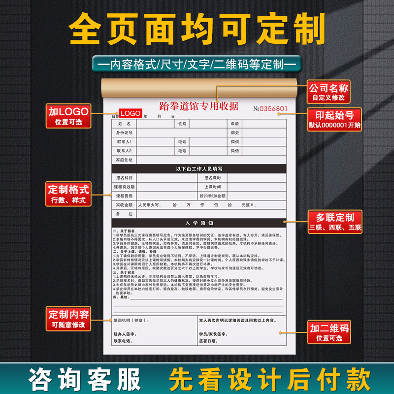 【跆拳道馆培训专用】票据定制二联武道入学协议单教育机构学员报名收据训练中心课程登记合同俱乐部收费单据