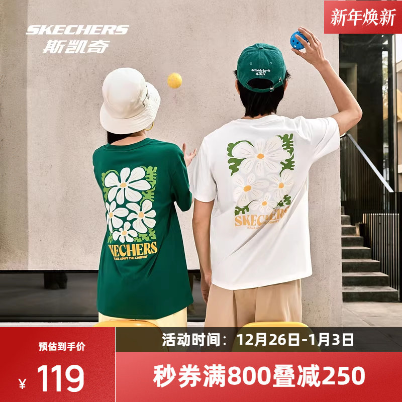 斯凯奇情侣T恤男女款印花运动短袖绿色户外健身白色舒适宽松休闲