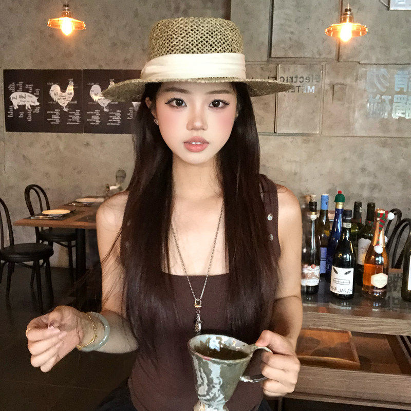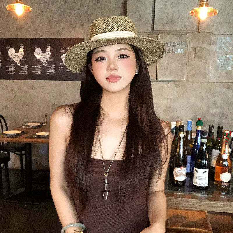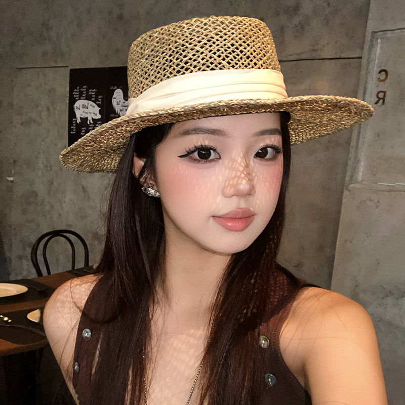 法式复古老钱风编织平顶草帽女夏季海边度假风镂空防晒帽遮阳礼帽