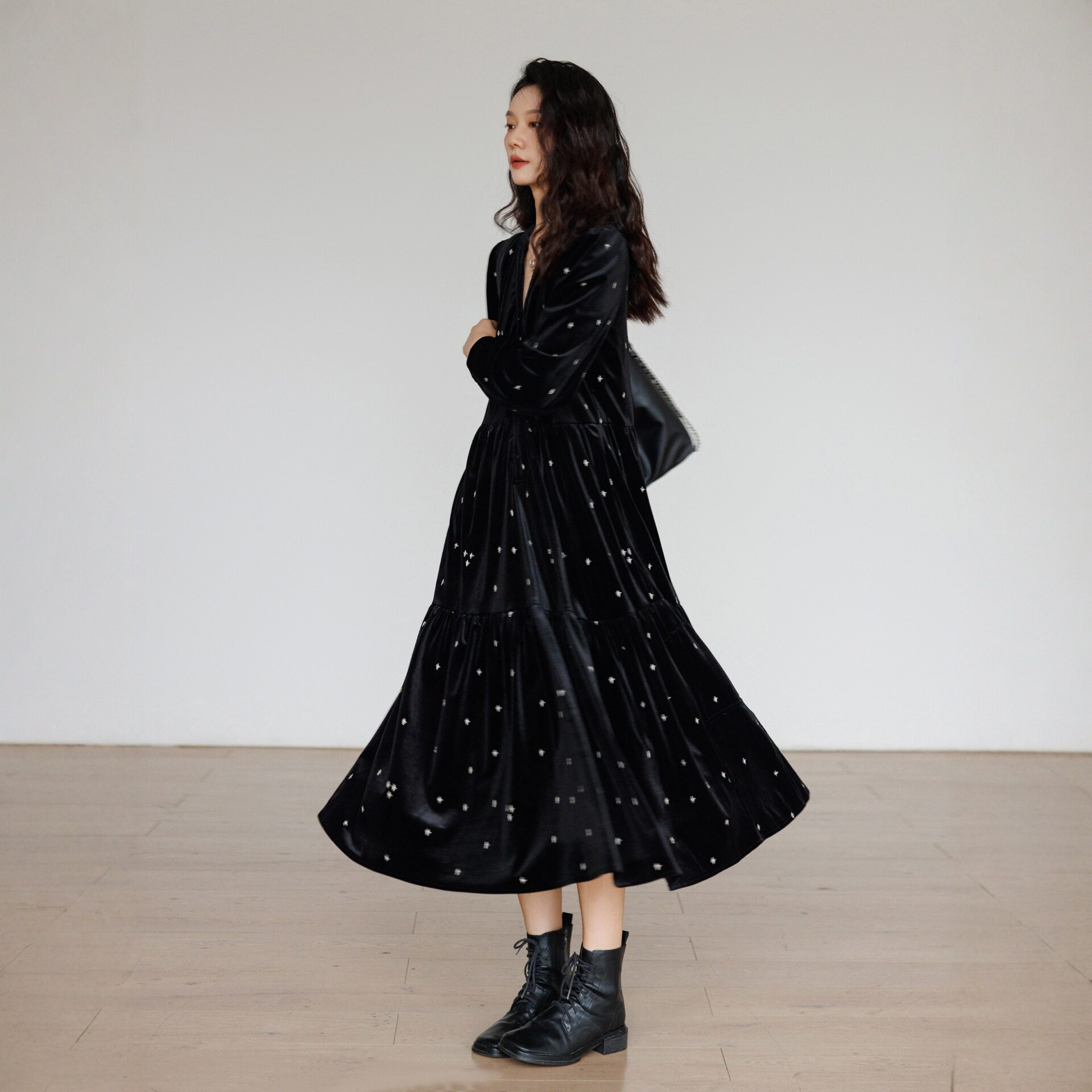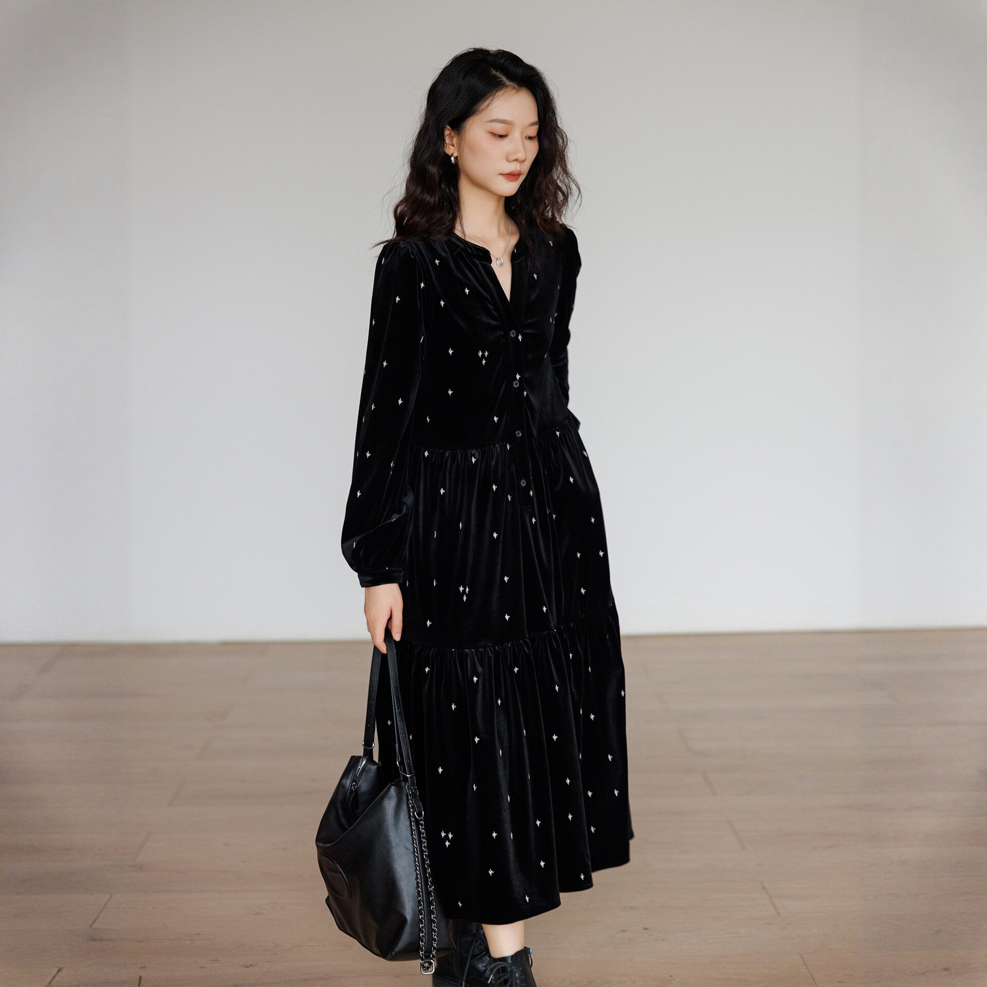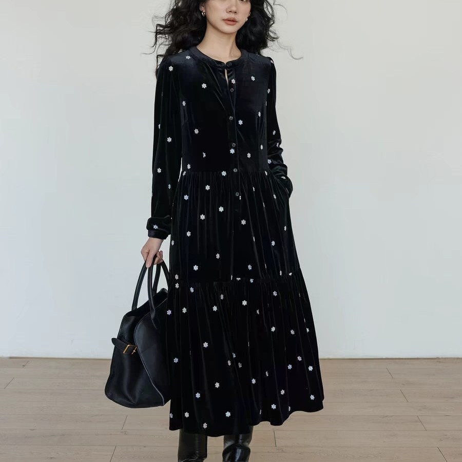 2025新款法式复古丝绒连衣裙长袖印花长袖黑色大码宽松中长款气质