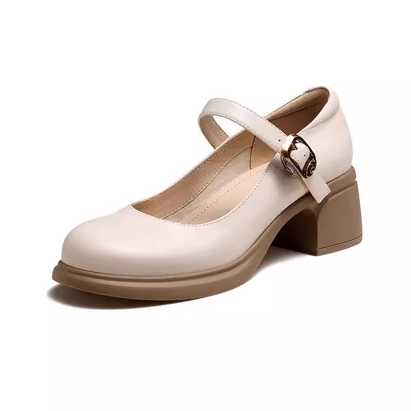 六点大叔真皮粗跟单鞋女2025春季新款珍珠伴娘白色高跟鞋玛丽珍鞋
