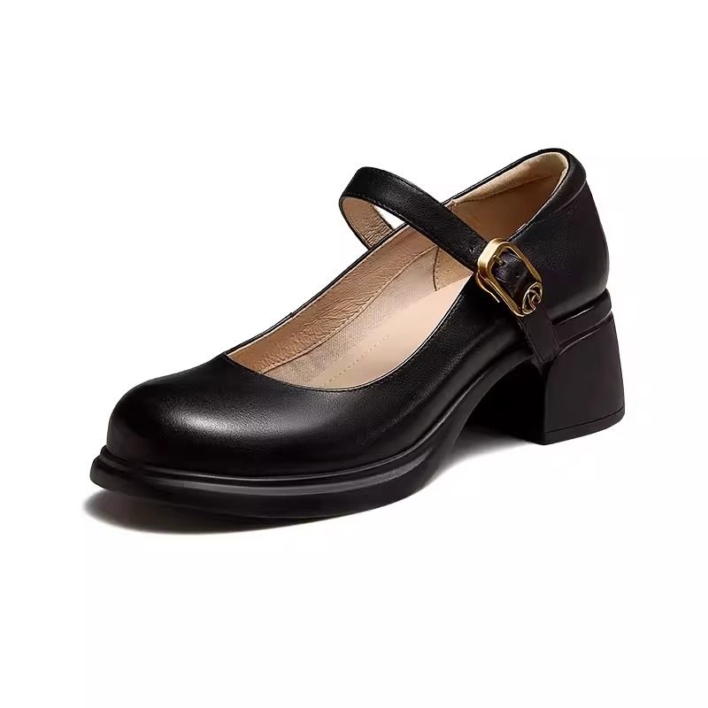 真皮~法式复古黑色高跟鞋2025春季一字带通勤工作粗跟玛丽珍单鞋