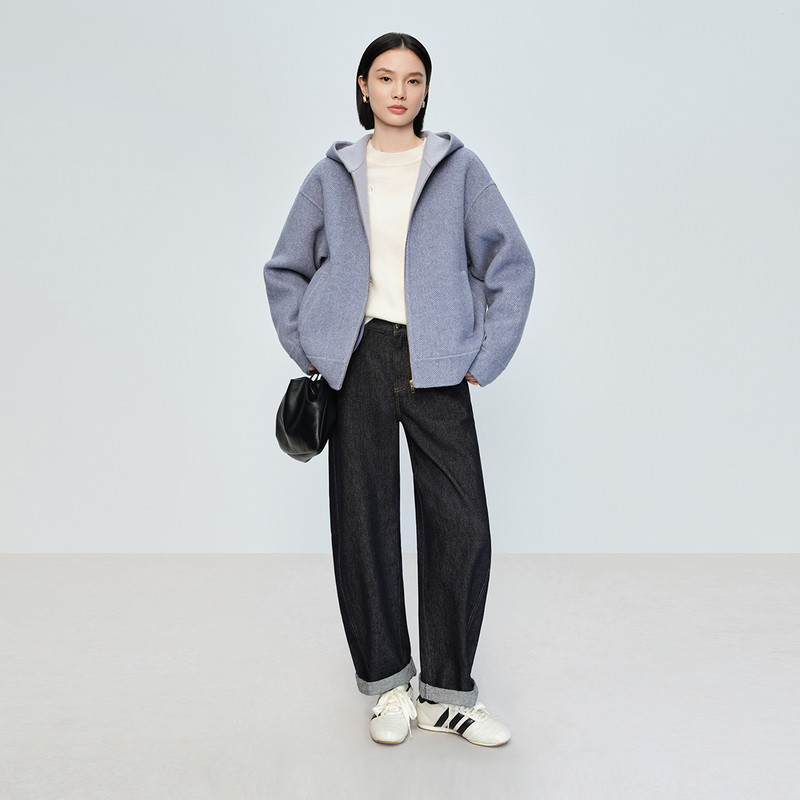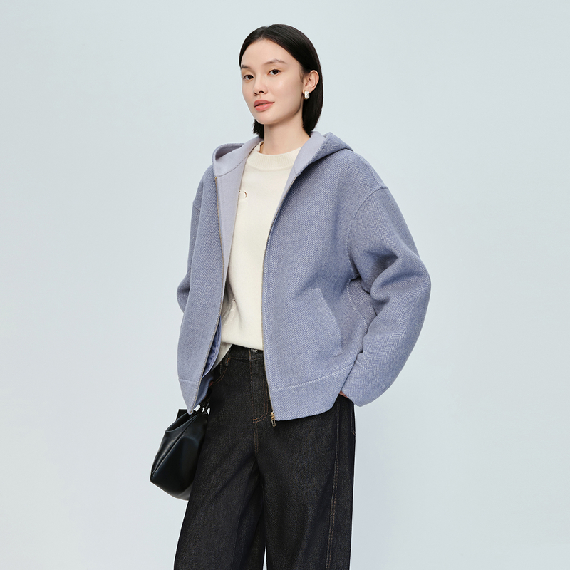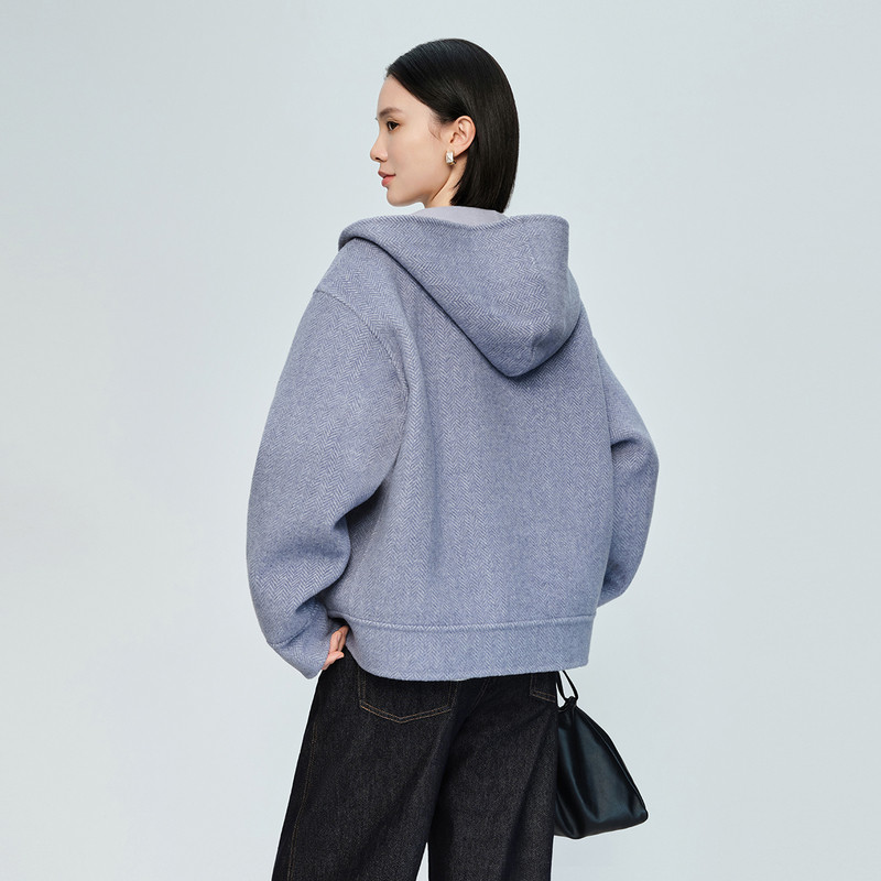 naivee25冬新款双面呢羊毛短大衣外套卫衣式连帽