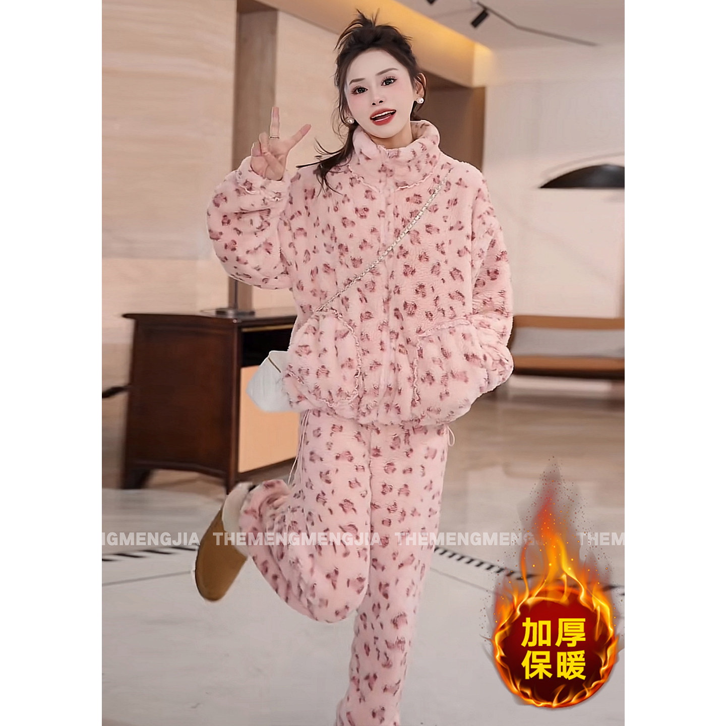 冬季高品质时尚豹纹睡衣套装女加厚保暖花边拼接珊瑚绒毛毛家居服