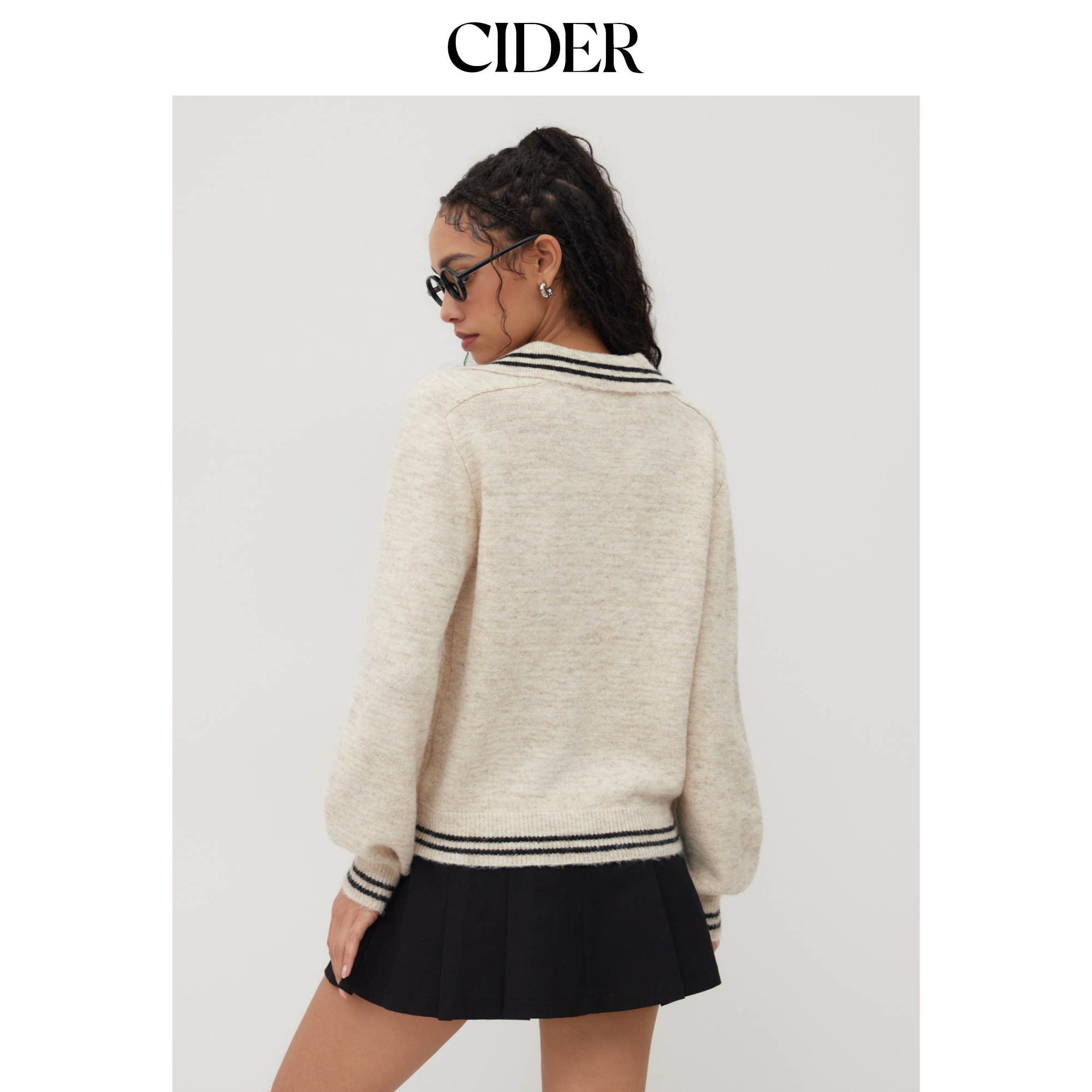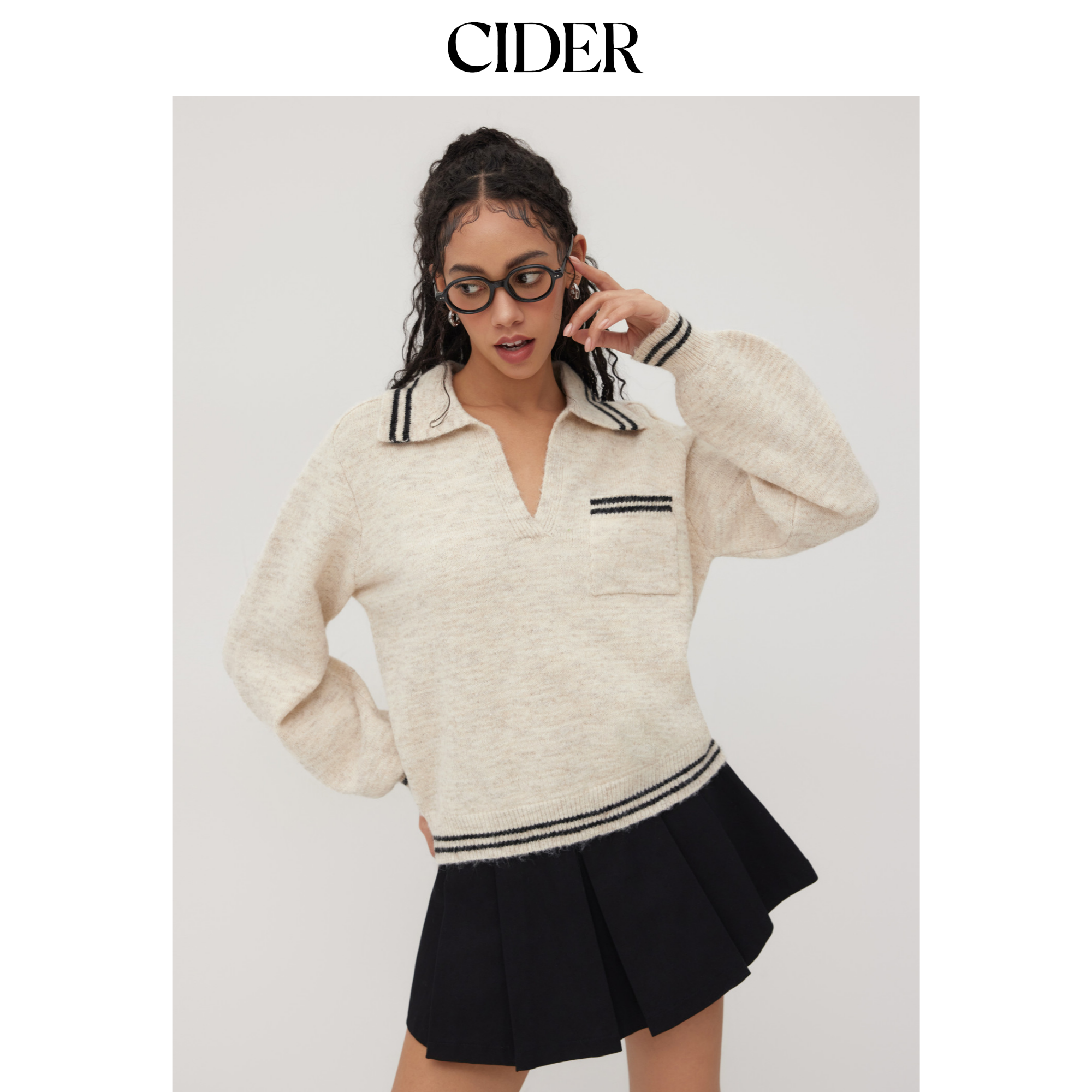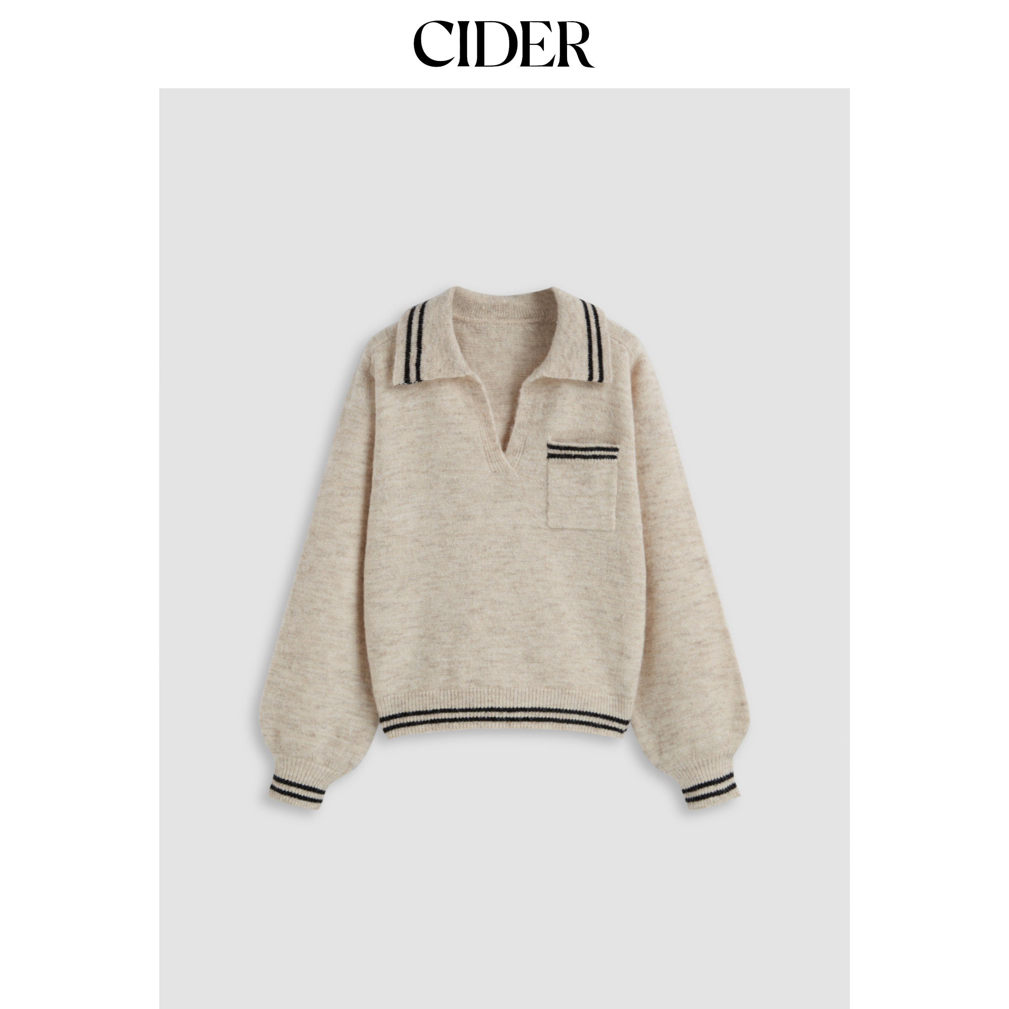 CIDER 春秋新品女装羊毛翻领条纹镶边宽松毛衣114075170