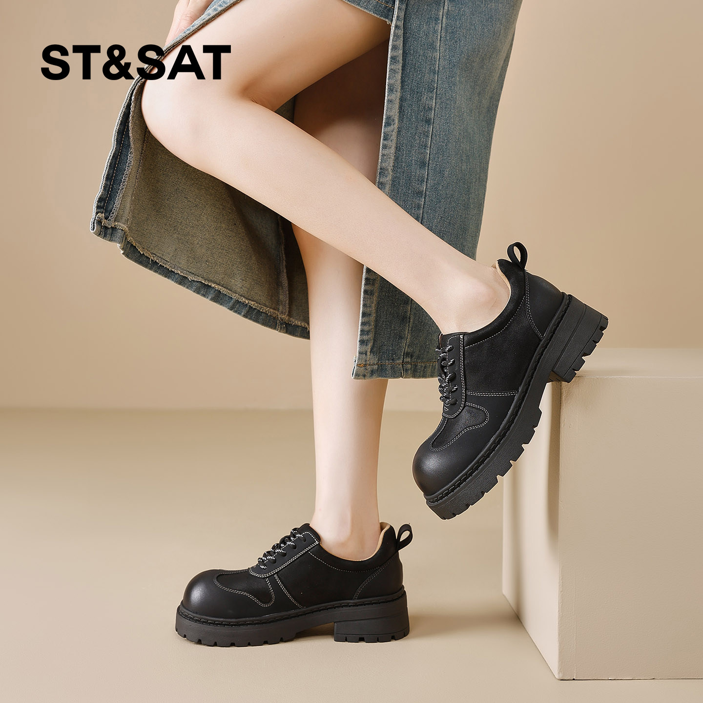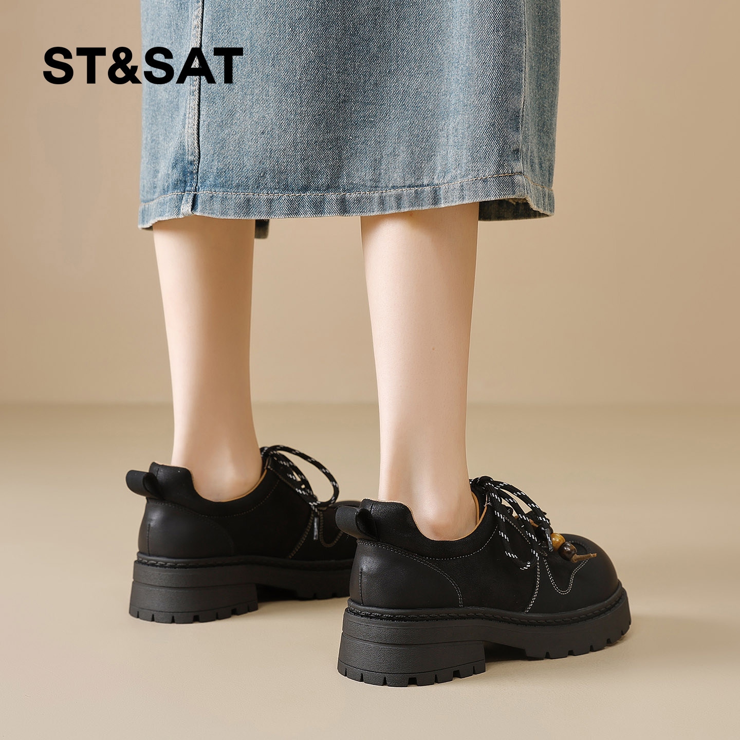 真皮厚底乐福鞋女2025春秋新款百搭学院黑色单鞋系带英伦风小皮鞋