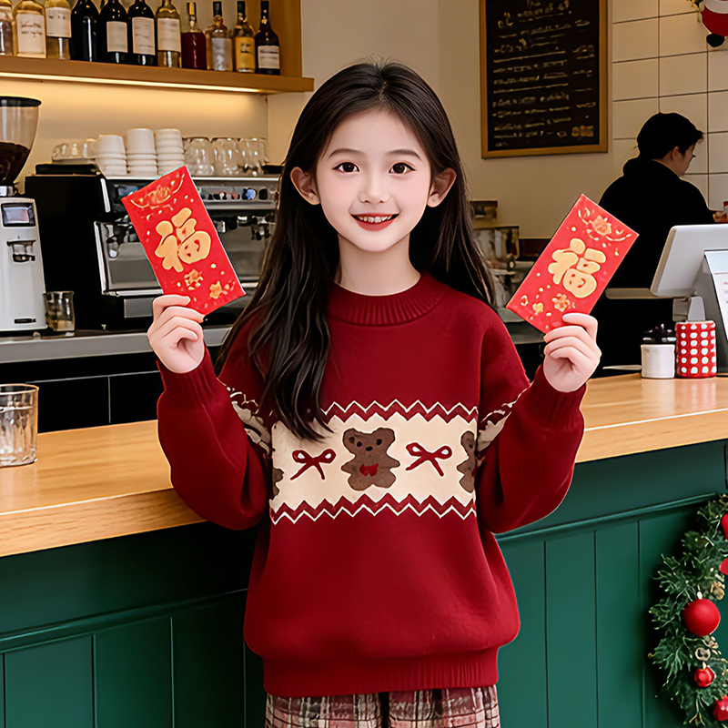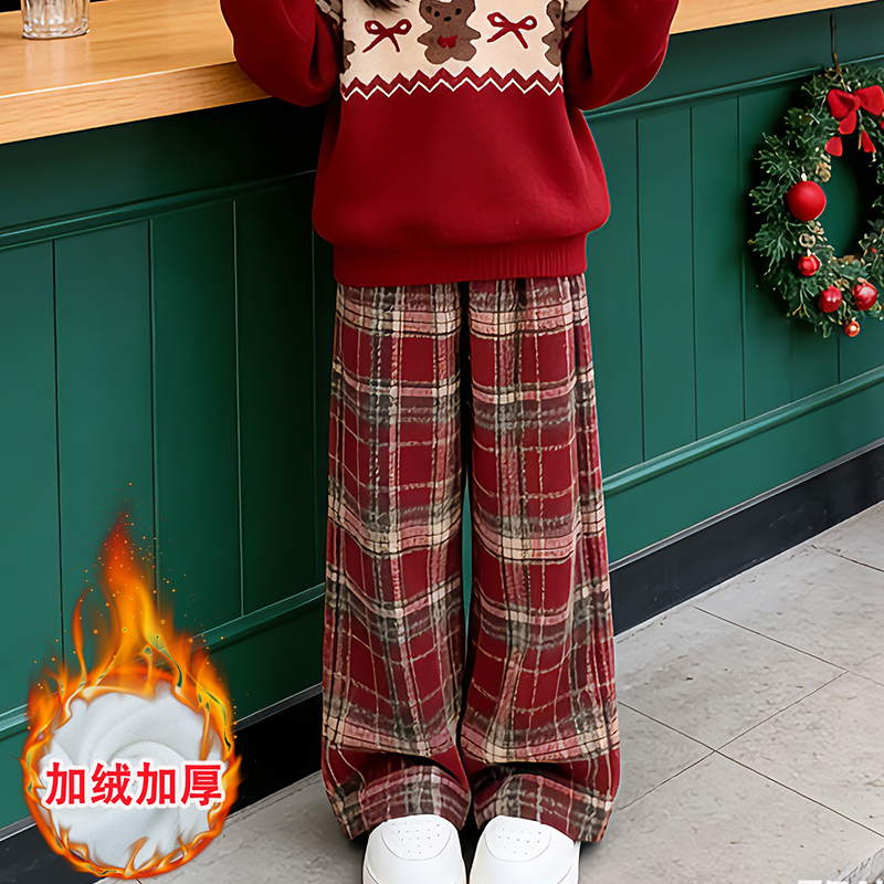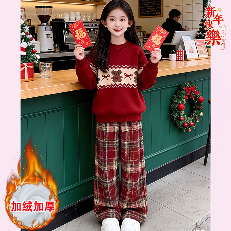 女童冬装套装红色卡通毛衣加绒格子阔腿裤2026新款新年衣服针织衫