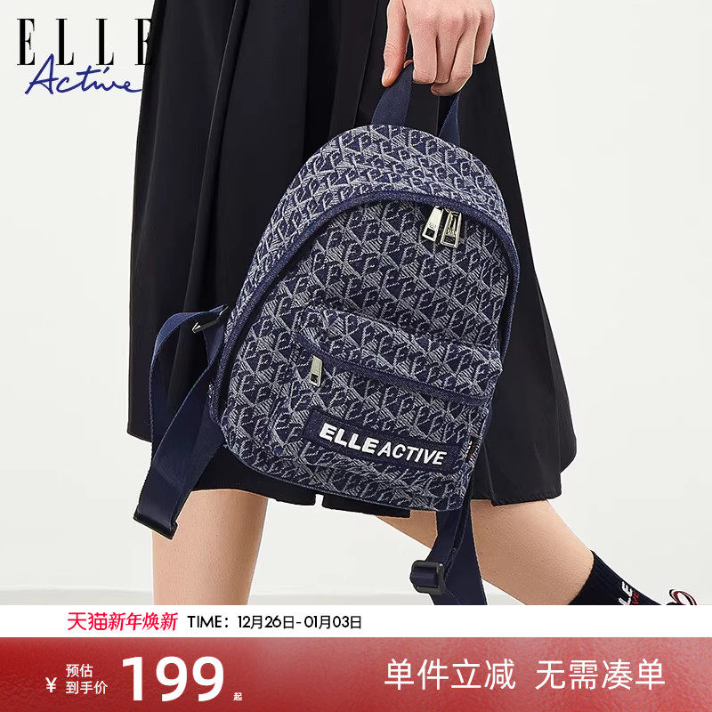 ELLE Active女包仿牛仔复古背包便携轻便满印字母提花休闲双肩包
