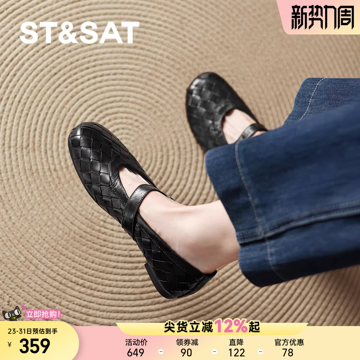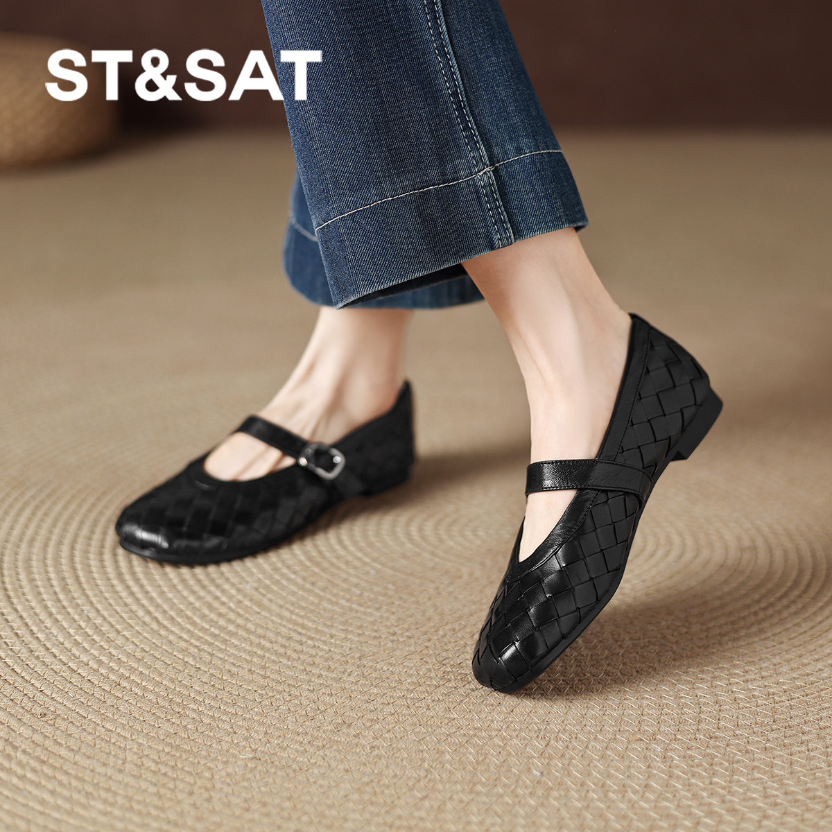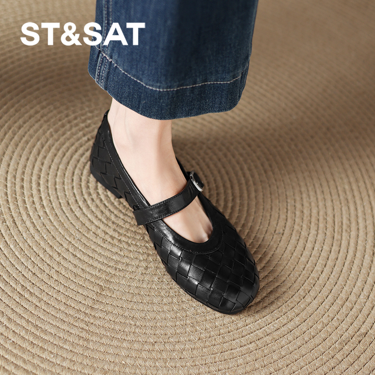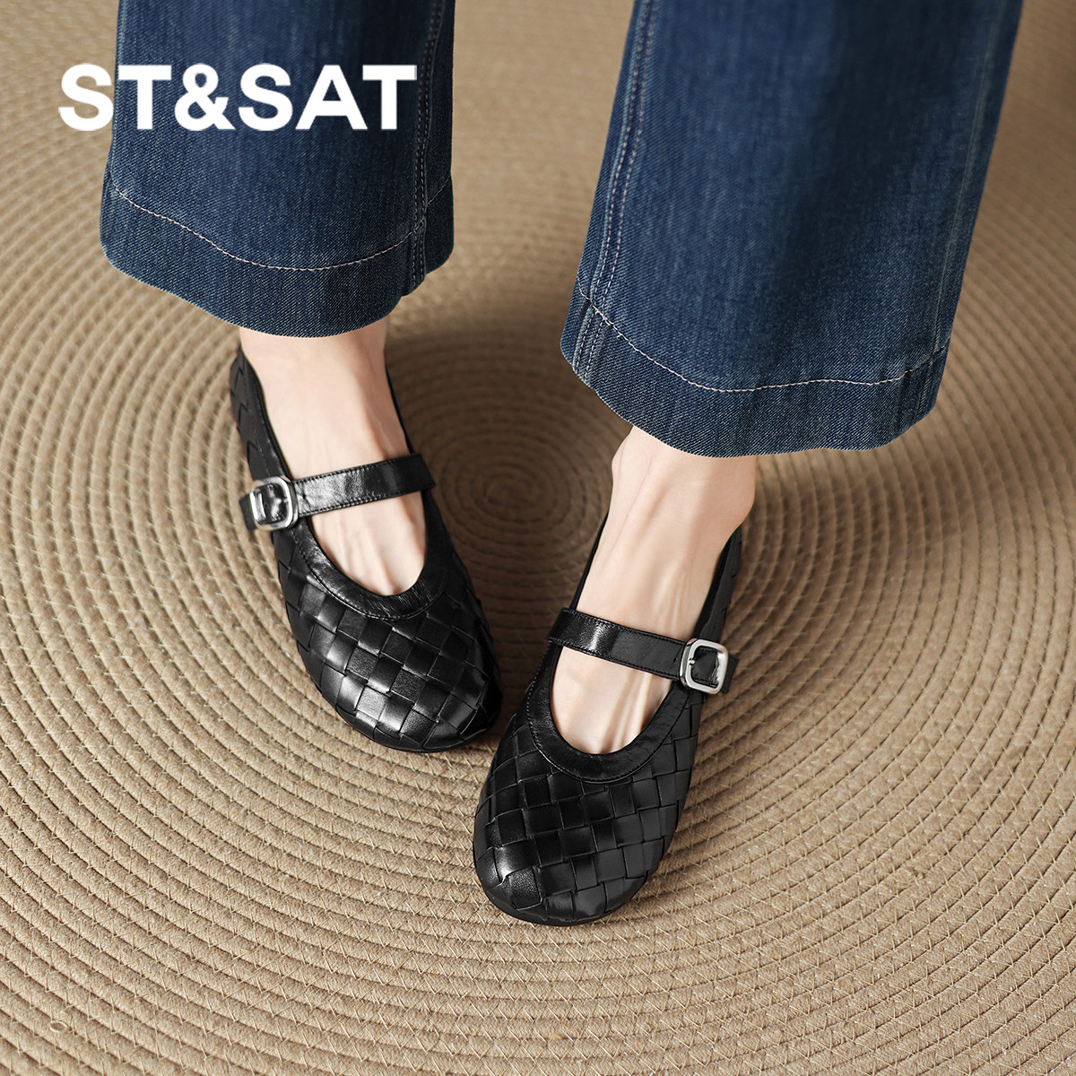 星期六真皮编织单鞋女新款春季浅口玛丽珍女鞋不累脚平底单鞋