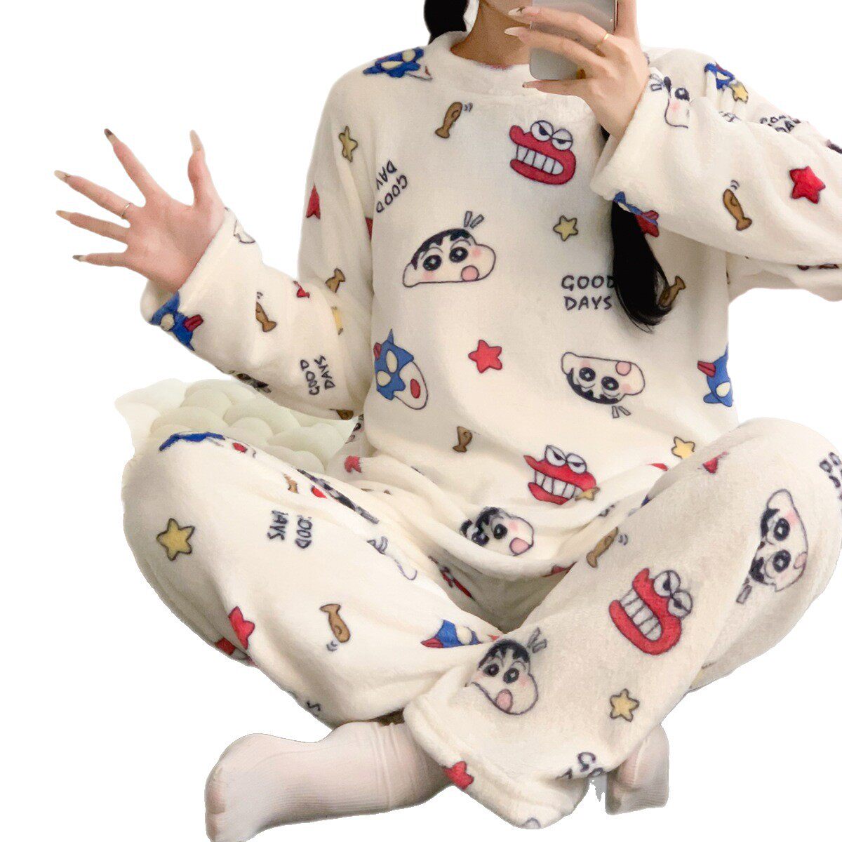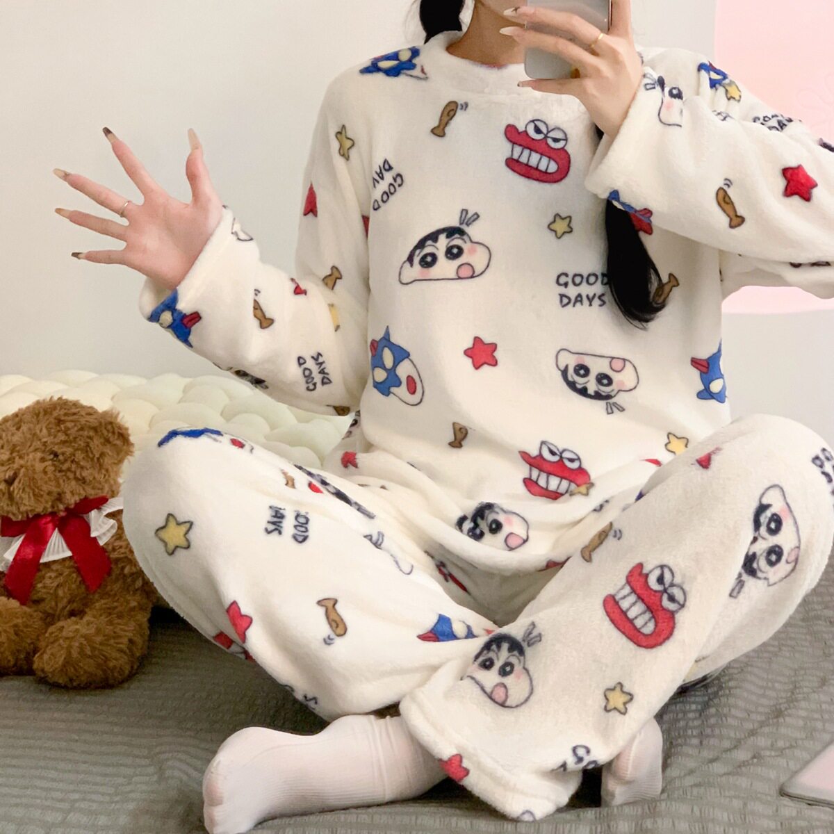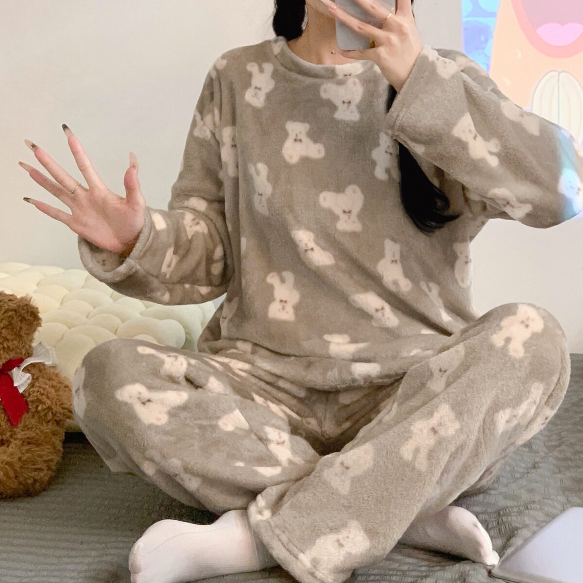 加绒加厚珊瑚绒冬季睡衣女秋冬季可爱学生家居服套装可外穿波点