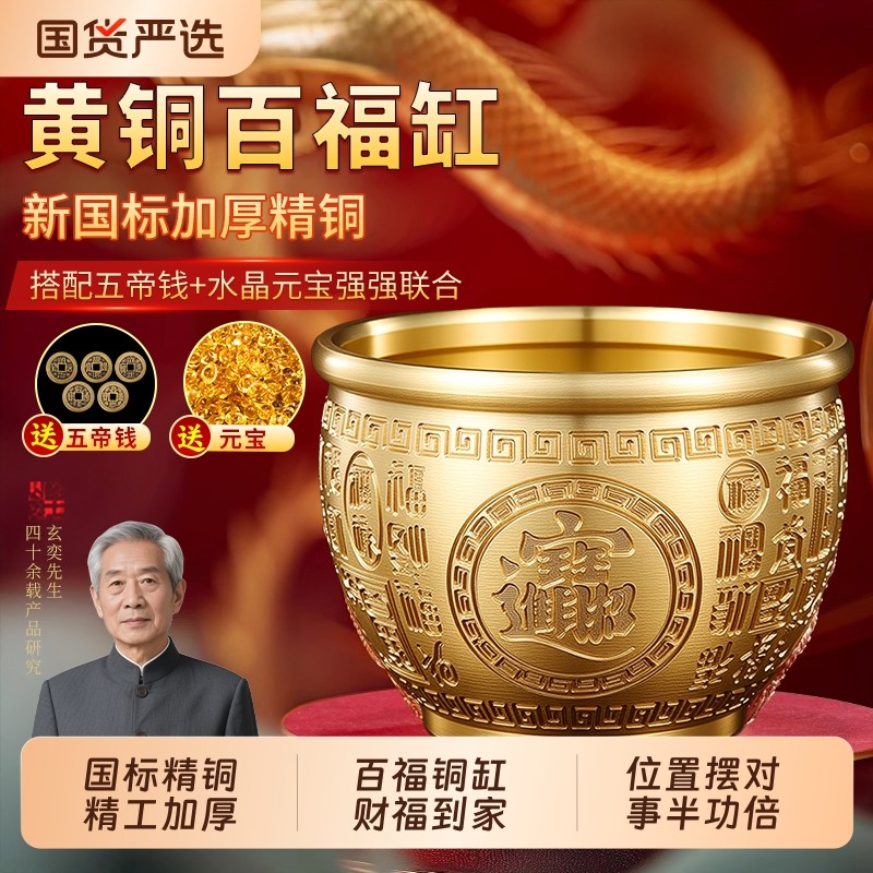黄铜米缸百福缸纯黄铜摆件聚宝盆新居乔迁客厅玄关元宝水晶冰箱