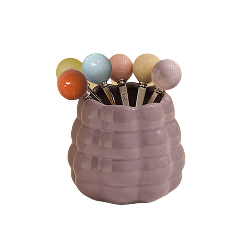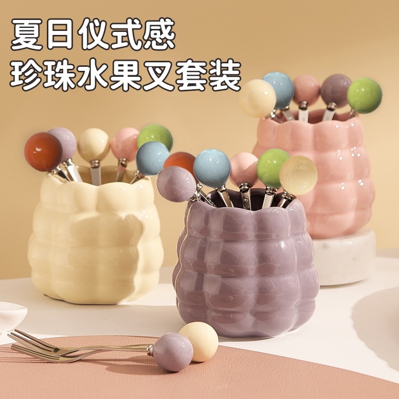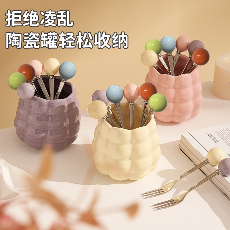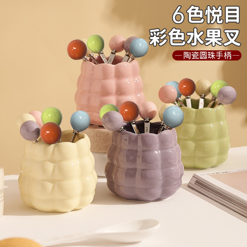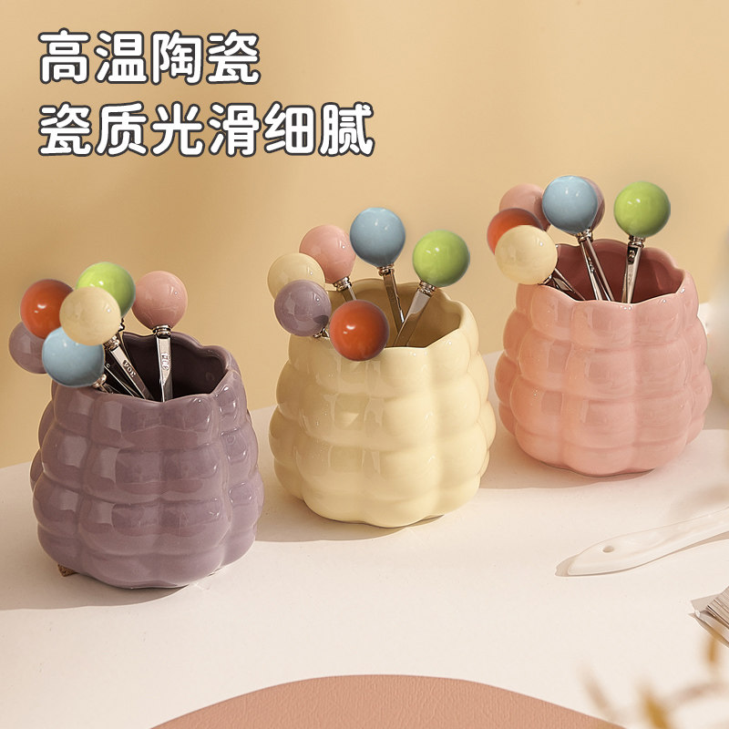 水果叉子多巴胺陶瓷圆球不锈钢叉创意陶瓷收纳罐高颜值可爱水果签