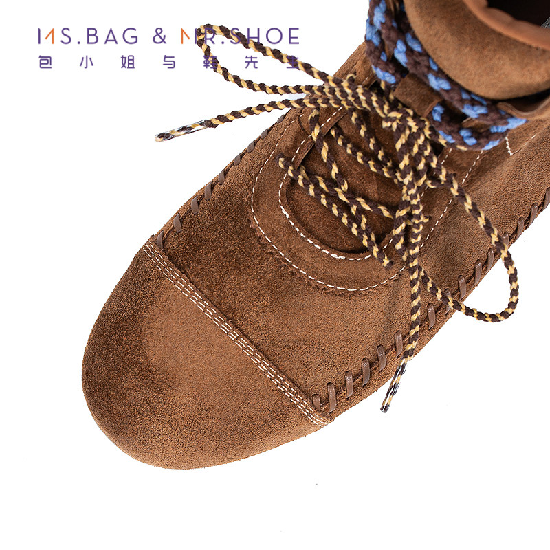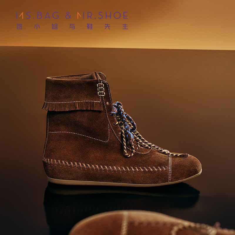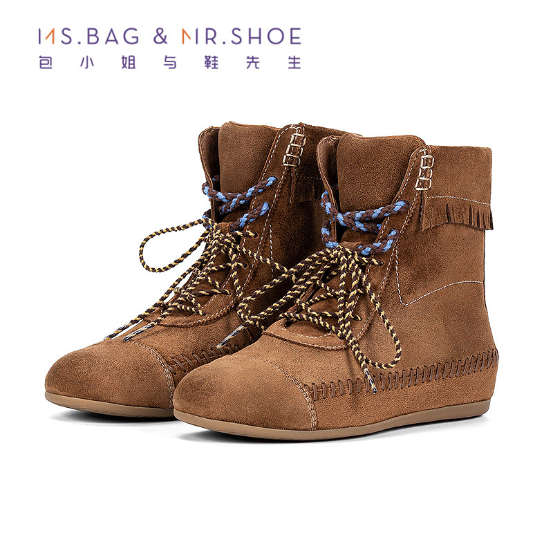 包小姐与鞋先生2025年冬季新品穿皮工艺系带平底短筒靴女254183