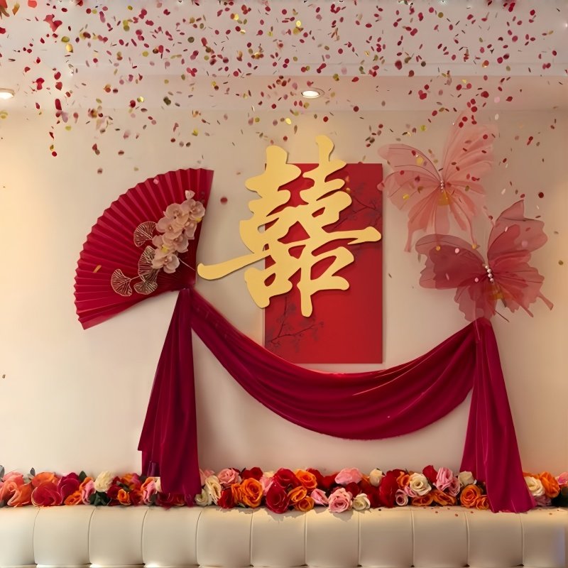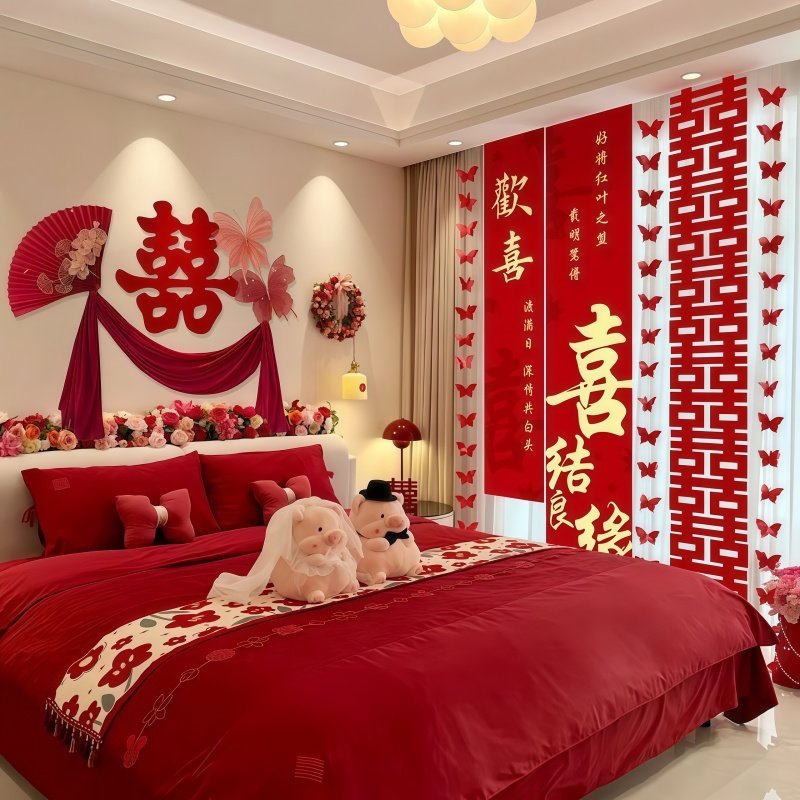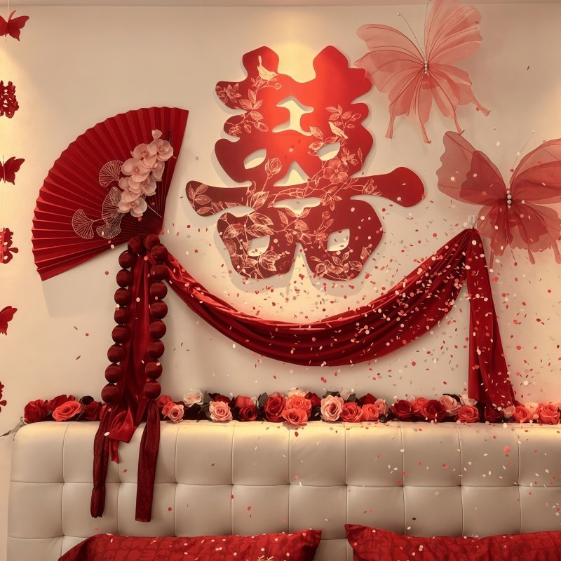 结婚女方卧室床头背景墙布置装饰大喜字拉花套装氛围客厅沙发全屋