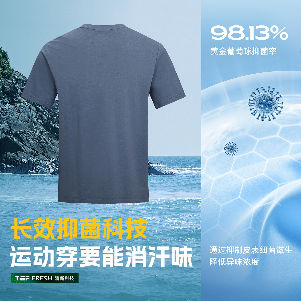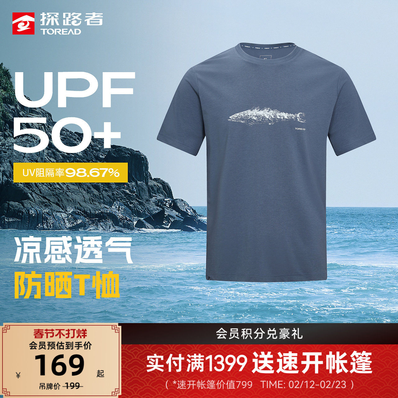 探路者男式功能短袖T恤UPF50+防晒凉感透气清新抑菌户外运动T恤