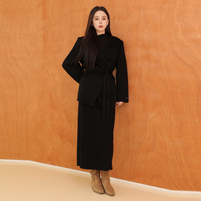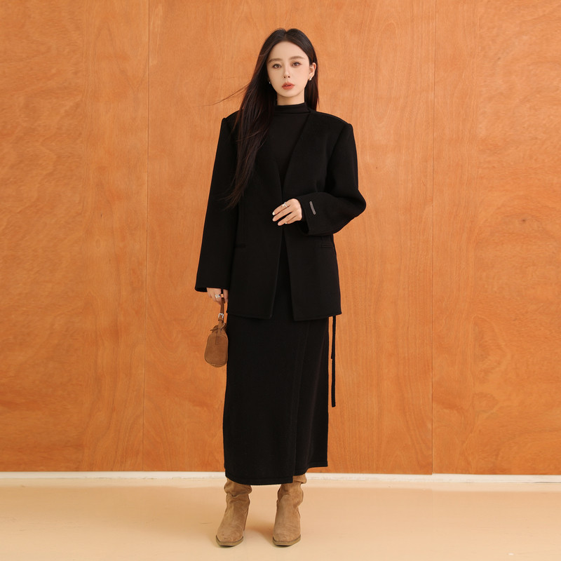 COCOBELLA设计感假两件大翻领毛呢外套女秋冬新款黑色大衣WL0002