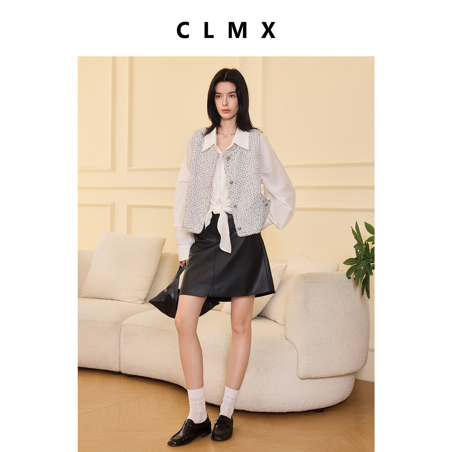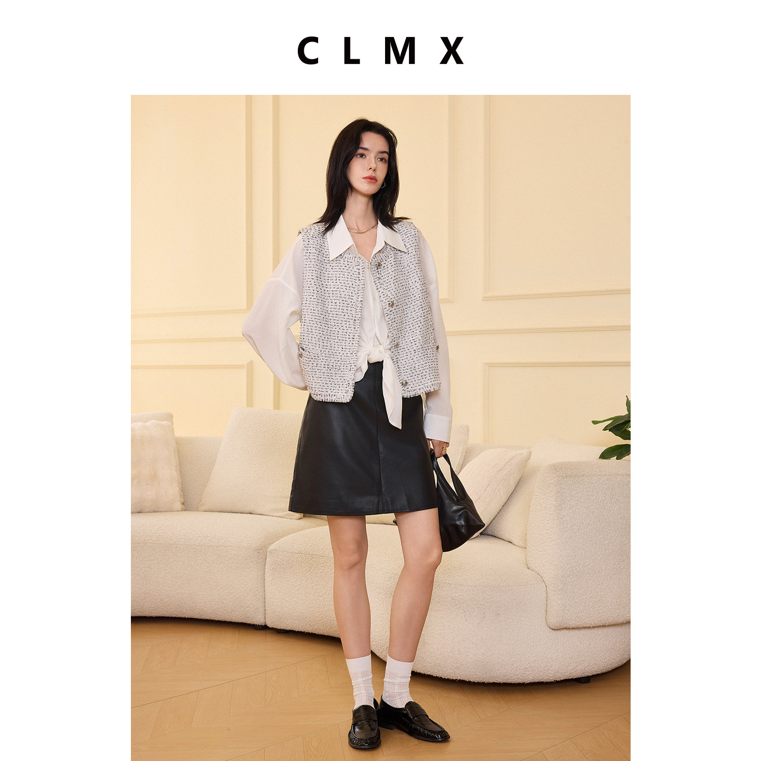 CLMX流苏圆领马甲小香风带子纱棉亚麻混纺提花花呢面料上衣外套女