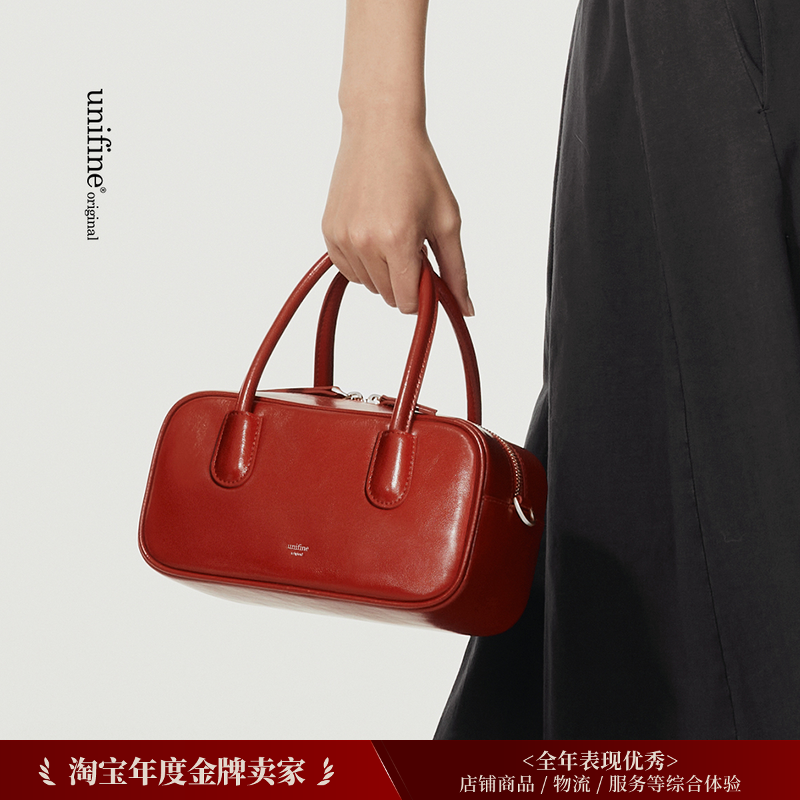 unifine新款波士顿包红色包包通勤斜挎包枕头包手提包女真皮小众