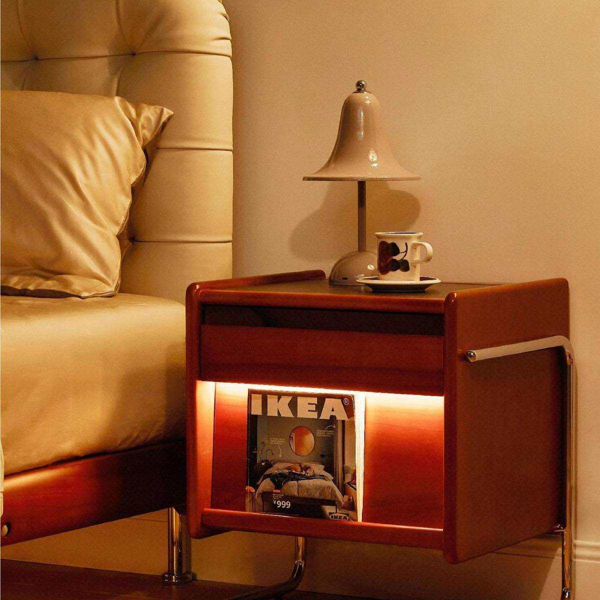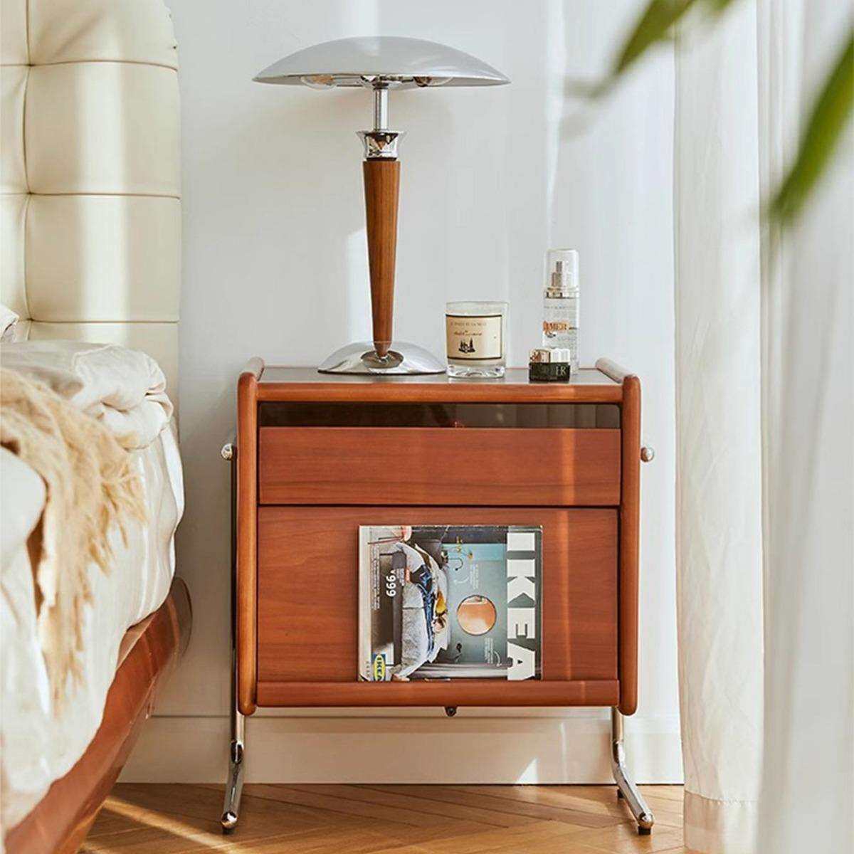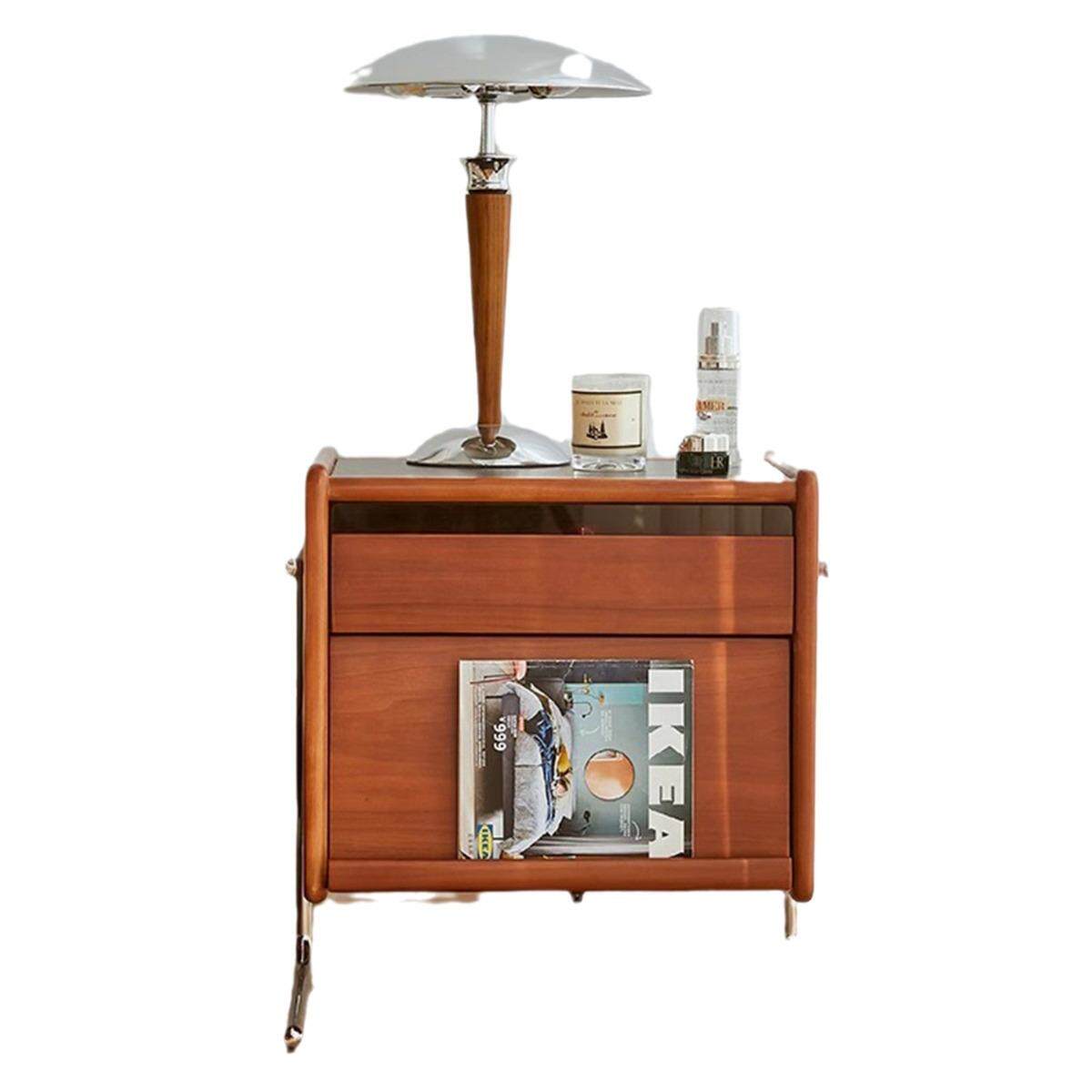 严选实木中古风岩板床头柜卧室樱桃木床边杂志架不锈钢沙发边几柜