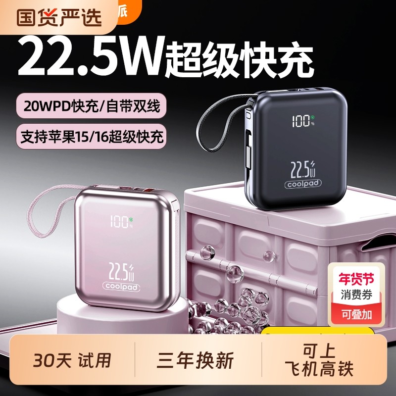 新国标3C认证酷派大容量自带四线Type-C线充电宝新款2万毫安时兼容22.5W超级快充1万电超薄小巧便携移动电源