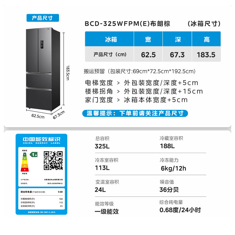 Midea/美的BCD-325WFPM(E)美的325L法式多门冰箱家用无霜一级节能
