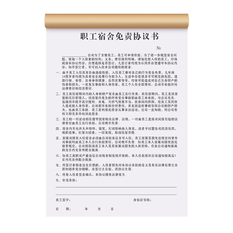 员工宿舍免责协议书职工入职承诺单据住宿临时入住卫生信息登记表安全责任申请合约本寝室公寓楼档案管理合同