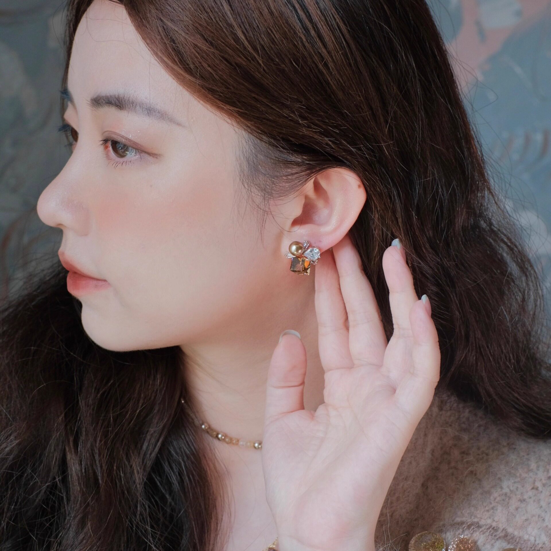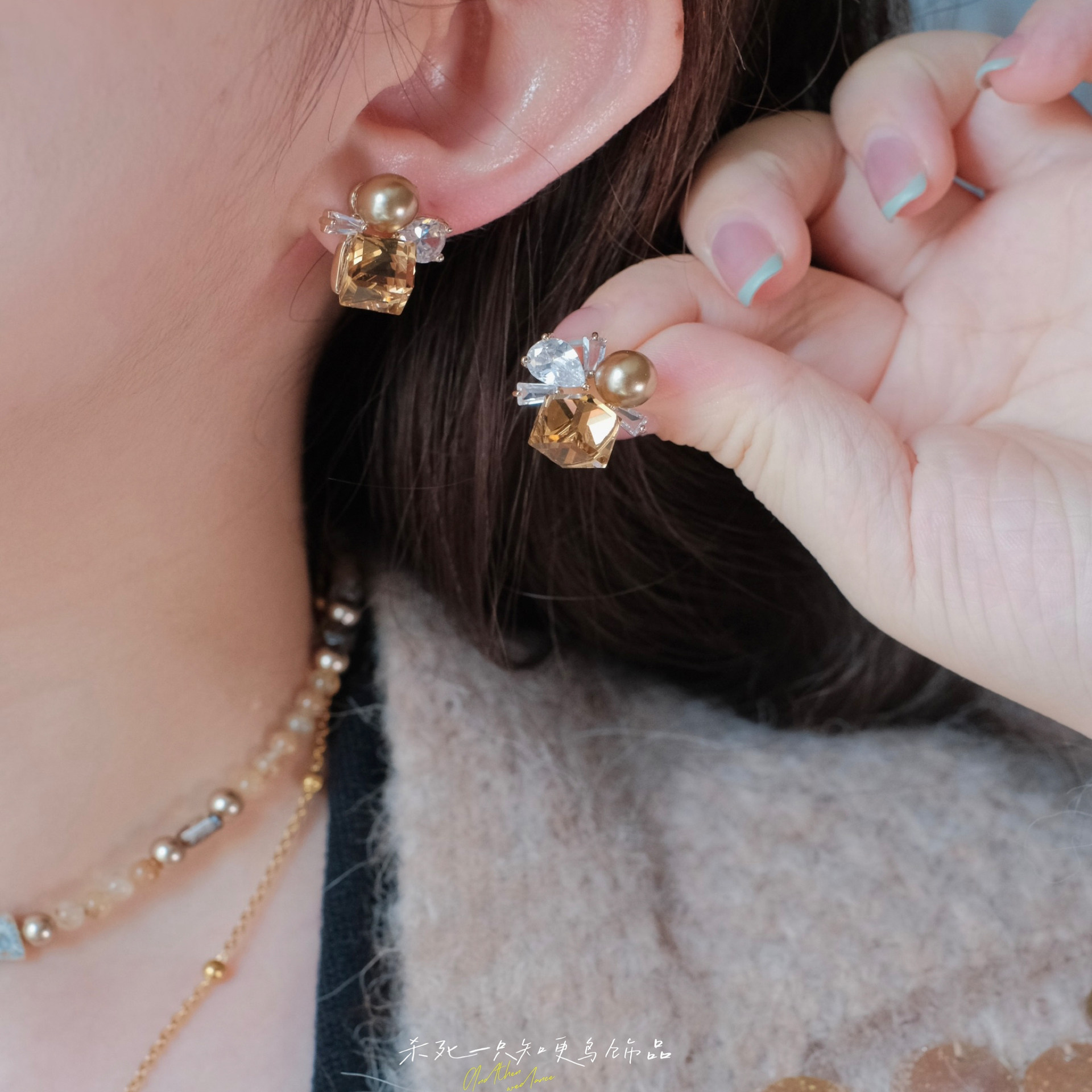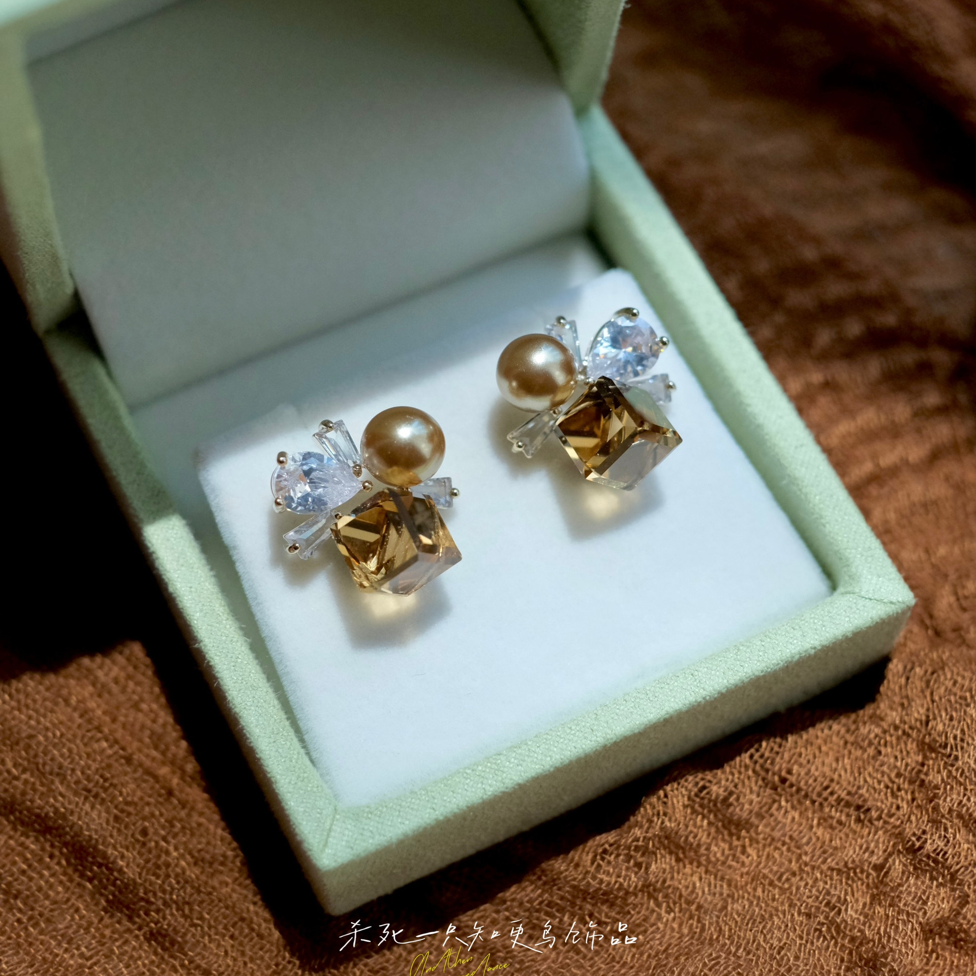 《落日熔金》法式轻奢高级感秋冬咖色珍珠方糖水晶耳钉耳环耳夹女